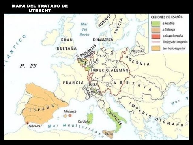 El tratado de Utrecht fue escrito en la ciudad Holandesa de Utrecht, como cuyo nombre indica, en 1713 entre España, Saboya, Gran Bretaña y Austria para dar por finalizada la Guerra de Sucesión Española. España cedió a Austria el Milanesado, Nápoles, Cerdeña, Flandes y Luxemburgo, a Seboya cedió Sicilia. Gran Bretaña obtuvo Gibraltar y Menorca que estuvo ocupada hasta 1802. Cuando terminó la Guerra de Sucesión se inció la unificación de los reinos de Aragón y de Castilla poninedo unas leyes únicas. Los Decretos de Nueva Planta acumulaban los distintos fueros e instituciones de los distintos territorios de la Coroga de Aragón y les imponía un sistema administrativo castellano.