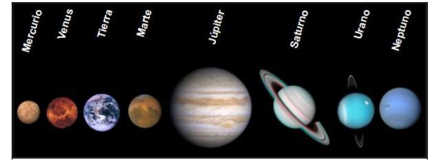 Los planetas, divididos en planetas interiores y planetas exteriores o gigantes. Entre estos últimos Júpiter y Saturno se denominan gigantes gaseosos, mientras que Urano y Neptuno suelen nombrarse gigantes helados. Todos los planetas gigantes tienen a su alrededor anillos. Los planetas tienen suficiente masa para limpiar la vecindad de su órbita.