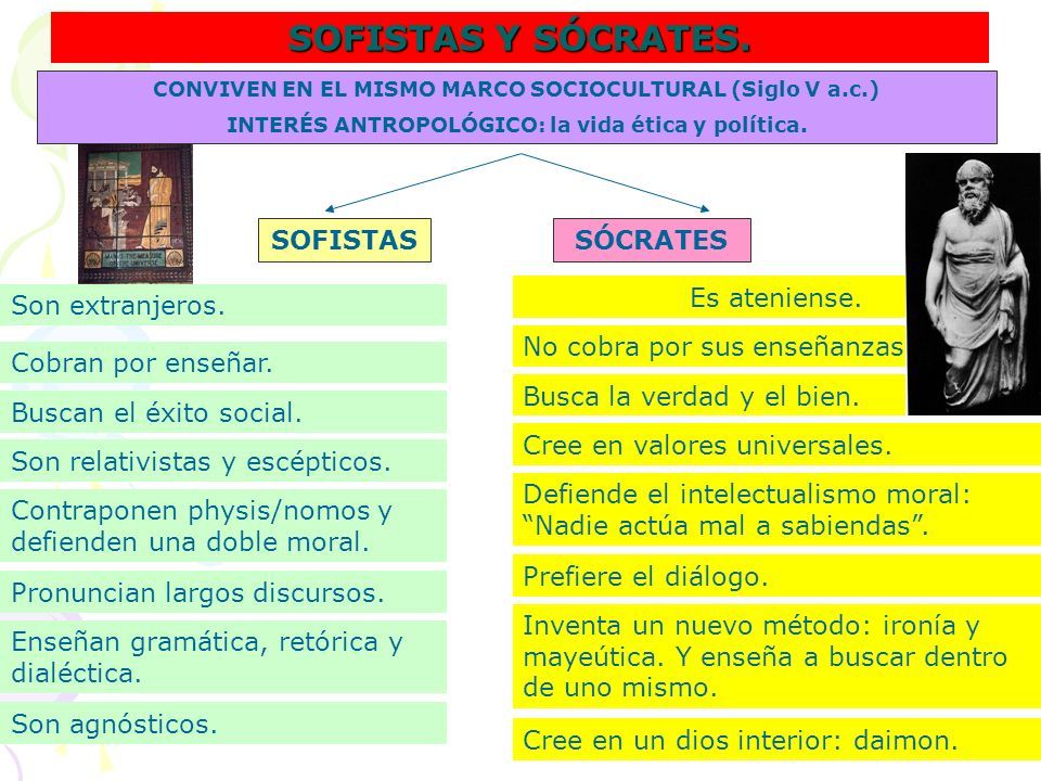 En este contexto surgen los Sofistas, grupo de pensadores e intelectuales que se dedicaron a enseñar a aquellos ciudadanos que aspiraban a alcanzar el éxito social y triunfar en la política (siendo los primeros maestros que cobraban por sus enseñanzas). Los sofistas eran extranjeros que iban de ciudad en ciudad, le enseñaban a los jóvenes atenienses la retórica. Los sofistas eran pragmáticos, relativistas (piensan que no existen valores morales absolutos ya que todo es relativo) y escépticos (no creen que el hombre pueda conocer la verdad absoluta). Sus enseñanzas poseen unas características comunes, son las siguientes: 1. El interés por el hombre y la sociedad, relacionado sobre el fenómeno de la civilización y la cultura. 2. El mantenimiento de una posición relativista. 3. Hacen una distinción entre las leyes sociales (nómos) consideradas producto humano y las leyes de la naturaleza (physis). 4. El interés por la retórica y la erística, porque en la sociedad democrática el de la palabra y del discurso significaba el éxito y la consideración de sus miembros. 5. Lo que guiaba la investigación de los sofistas era la finalidad práctica, es decir, enseñar el arte de vivir y de gobernar. Este grupo de pensadores se preguntaba fundamentalmente por: la naturaleza ley convencional técnica (como la producción creativa) ciudad (como una empresa colectiva) logos educación verdad