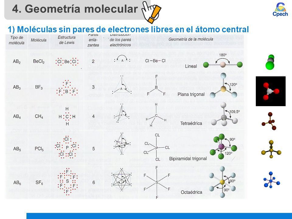 GEOMETRÍA MOLECULAR. La geometría molecular o estructura molecular se refiere a la disposición tridimensional de los átomos que constituyen una molécula. Determina muchas de las propiedades de las moléculas, reactividad, polaridad, fase, color, magnetismo, actividad biológica, etc. Actualmente, el principal modelo es la teoría de repulsión de pares de electrones de valencia (TRPEV), empleada internacionalmente por su gran predictibilidad. (COLABORADORES DE WIKIPEDIA EN https://es.wikipedia.org/wiki/Geometr%C3%ADa_molecular).