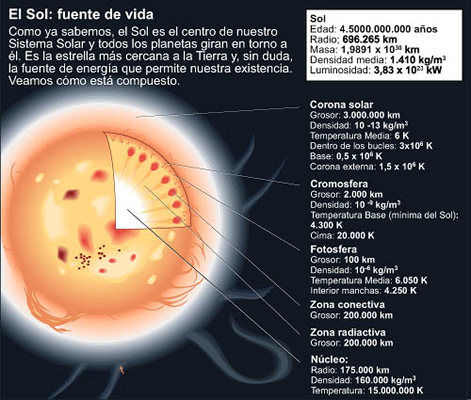 El Sol, del cual depende la existencia de vida en la Tierra, es una estrella típica de clase media: ni muy grande ni muy chica, ni muy luminosa ni muy débil, ni muy joven ni muy vieja. Una estrella común y corriente, como hay millones y millones en el universo. A partir del movimiento de la Luna en torno a la Tierra, y de esta última en torno al Sol, se puede deducir la masa del Sol en términos de la masa de la Tierra. El resultado es una masa 330.000 veces la de la Tierra, o sea, 2 x1033 gramos (un 2 seguido de 33 ceros). Su radio es de 690.000 kilómetros, 109 veces mayor que el de la Tierra. Su volumen es 1.300.000 veces mayor que el de la Tierra. Su densidad (cantidad de materia por centímetro cúbico) es menor que la de la Tierra, alcanzando solo a 1,4 gramos por centímetro cúbico, apenas mayor que la densidad de agua, que es de 1 gramo por centímetro cúbico. La gran energía La principal fuente de energía existente en la Tierra es el Sol, ya que de él derivan las fuentes de energía renovables y no renovables. El Sol es la causa de la formación de varios procesos naturales como son el viento y la evaporación del agua (provocando las precipitaciones de lluvia, nieve o granizo). También es imprescindible para que los vegetales realicen la fotosíntesis. Este astro además interviene en la formación de olas, mareas y en el calentamiento del agua del mar. Es aprovechado como fuente calórica y luminosa, ya sea directamente o a través de estructuras que permiten su mejor aprovechamiento y su transformación en electricidad.
