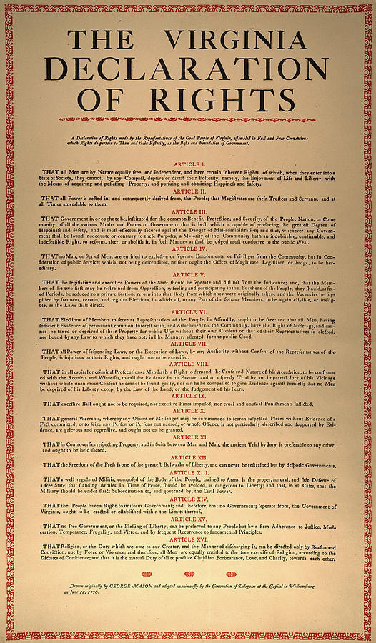 La Declaración de Derechos de Virginia, adoptada el 12 de junio de 1776, está considerada la primera declaración de derechos humanos moderna de la historia, aunque tiene un importante antecedente en la Carta de Derechos Inglesa (Bill of Rights) de 1689. Fue adoptada por la Convención de Delegados de Virginia como parte de la Constitución de Virginia en el marco de la Revolución Americana de 1776, en la que las 13 colonias británicas en América obtuvieron su independencia. A través de la Declaración de derechos de Virginia se animó a las demás colonias a independizarse de Gran Bretaña.