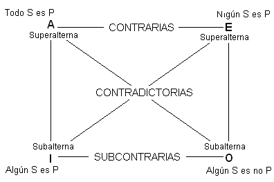 A = UNIVERSAL AFIRMATIVO. Término Sujeto tomado en su extensión universal; término Predicado particular; cualidad afirmativa. Todo S es P. E = UNIVERSAL NEGATIVO. Término Sujeto tomado en su extensión universal; término Predicado universal; cualidad negativa. Ningún S es P. I = PARTICULAR AFIRMATIVO. Término Sujeto tomado en su extensión particular; término Predicado en su extensión particular; cualidad afirmativa. Algún S es P. O = PARTICULAR NEGATIVO. Término Sujeto tomado en su extensión particular; término Predicado en su extensión universal; cualidad negativa. Algún S no es P. Se llaman juicios opuestos a los que teniendo los mismos términos difieren en cantidad, en cualidad o en ambas. Se representan en cada uno de los vértices del cuadrado de oposición, estableciéndose las siguientes relaciones: A y E son contrarios porque difieren en cualidad siendo universales. I y O son subcontrarios, porque siendo particulares difieren en la cualidad. A con respecto a O, e I con respecto a E son contradictorios, porque difieren en cantidad y cualidad. A con respecto a I, y E con respecto a O son subalternos porque difieren en la cantidad.