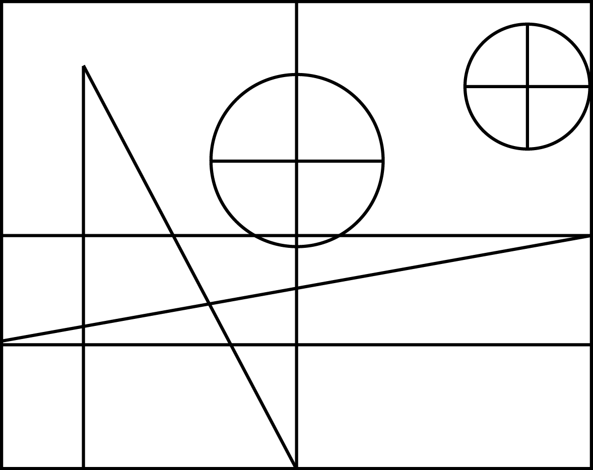 Ejercicio de composición En una hoja que tenga un formato rectangular, y usándola en una orientación horizontal traza con un lápiz 2H el esquema de distribución de espacios que se muestra en este apunte. En esta ocasión usarás la retícula para crear un cuadro abstracto, es decir elementos que tiendan a la geometría y que tengan desconexión total con el mundo real, es decir el nivel de representación requerido es simbólico. Recuerda que el propósito en este caso no es el tema, sino aprovechar la retícula que la obra nos ofrece.