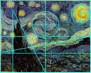 Estructura compositiva Observa la composición del cuadro de Vincent Van Gogh, es dinámica tiene tres puntos focales importantes en la obra que es la zona del árbol, la zona del viento y la luna. Lo demás apoyan a estos con un peso visual menor. La disposición geométrica en la que se encuentra encajada nos da una retícula llena de movimiento y dinamismo, pues está presente una asimetría bien equilibrada.