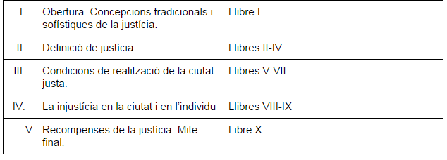 A continuació un resum al contingut del llibre per comprendre millor l’antologia platònica.LLIBRE I → Discussió sobre què és la justícia. Cèfal i Polemarc pensen que la justícia es destruir el que es deu. Intervé el sofista Trasímac i situa el problema de la justícia en l’àmbit del poder. Sòcrates opina que la justícia del governant busca el millor per els seus súbdits.LLIBRE II → Glaucó proposa la calcificació triartita dels béns – bens desitjables per si mateixos amb independència de les seves conseqüències, bens desitjables per si mateixos i per les seves conseqüències (està d’acord Sòcrates), i per últim bens desitjables pels seus beneficis indirectes (la gent està d’acord). Els germans de Plató demanen a Sòcrates la demostració de la preferència per la vida justa en relació a la vida injusta. Es discuteix sobre la justícia en l’individu i en la ciutat. Formació de la ciutat i dels seus estaments.LLIBRE III → Continuació dels conflictes del llibre II. Plantejament d’un nou procés educatiu, critica ens anteriors models.LLIBRE IV → Rebuig a la felicitat particular. La pobresa i la riquesa dels ciutadans. Les diferencies a la ciutat i la justícia. Parts de l’ànima i de les seves funcions.LLIBRE V → Les tasques de la dona a la ciutat, els nens, l’esclavatge i les lluites. Debat sobre la societat justa i filòsofs governant ciutats.LLIBRE VI → Concepció de la filosofia i el filòsof en els seus coneixements i el seu paper a la ciutat, l’ànima del filòsof. Possibilitats de formació filosòfica dels joves i possibilitats de convèncer a la multitud. L’analogia del Sol i del segment d’una línea.LLIBRE VII → Antologia d’una caverna i explicació. Estudis dels filòsofs governants i la formació d’aquests.LLIBRE VIII → Les classes de constitucions: aristocràcia, gènesi de les formes polítiques, des de la ciutat injusta, la timocràcia, l’oligarquia, la democràcia i la tirania.LLIBRE IX → Exposició del règim polític allunyat de la justícia. Proves sobre la superioritat de l’home just damunt de l’home injust. Conclusió: la justícia es millor que la injusticia que esclavitza a l’home i el perverteix.LLIBRE X → Continuació de la critica a la funció educativa. El problema del mal i la immortalitat del ànima. Les recompenses de la vida justa. El mite d’ER, sobre els premis i els càstigs que rebran en el mes enllà les ànimes dels justos i dels injustos. Importància de viure en la justícia.
