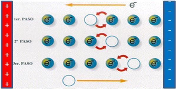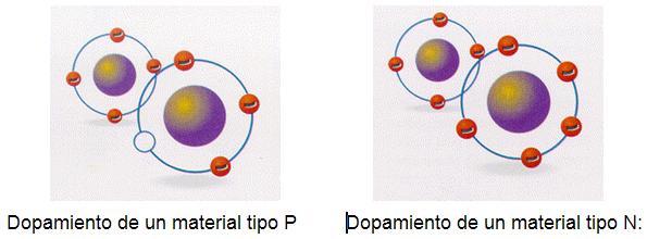 1.1. Dopamiento de semiconductores Materiales aislantes Se denomina al material con escasa conductividad eléctrica, no existen cuerpos absolutamente aislantes o conductores, sino mejores o peores conductores, son materiales muy utilizados para evitar cortocircuitos, forrando con ellos los conductores eléctricos, para mantener alejadas del usuario determinadas partes de los sistemas eléctricos que, de tocarse accidentalmente cuando se encuentran en tensión, pueden producir una descarga, para confeccionar aisladores los materiales utilizados más frecuentemente son los plásticos y las cerámicas. Materiales conductores Son aquellos materiales que ofrece poca resistencia al flujo de electrones o electricidad dejando pasar fácilmente la corriente eléctrica, de manera semejante como las tuberías conducen agua a través de un circuito hidráulico. Para que un cuerpo sea conductor necesita tener átomos con muchos electrones libres, que se puedan mover con facilidad de un átomo a otro. La diferencia entre un conductor y un aislante, que es un mal conductor de electricidad o de calor, es de grado más que de tipo, ya que todas las sustancias conducen electricidad en mayor o en menor medida. Un buen conductor de electricidad, como la plata o el cobre, puede tener una conductividad mil millones de veces superior a la de un buen aislante, como el vidrio o la mica. El fenómeno conocido como superconductividad se produce cuando al enfriar ciertas sustancias a una temperatura cercana al cero absoluto su conductividad se vuelve prácticamente infinita. En los conductores sólidos la corriente eléctrica es transportada por el movimiento de los electrones; y en disoluciones y gases, lo hace por los iones. Materiales semiconductores Es un material que se comporta como conductor o como aislante dependiendo de la temperatura del ambiente en el que se encuentre. Material sólido o líquido capaz de conducir la electricidad mejor que un aislante, pero peor que un metal. La conductividad eléctrica, que es la capacidad de conducir la corriente eléctrica cuando se aplica una diferencia de potencial, es una de las propiedades físicas más importantes. Ciertos metales, como el cobre, la plata y el aluminio son excelentes conductores. Por otro lado, ciertos aislantes como el diamante o el vidrio son muy malos conductores. A temperaturas muy bajas, los semiconductores puros se comportan como aislantes. Sometidos a altas temperaturas, mezclados con impurezas o en presencia de luz la conductividad de los semiconductores puede aumentar de forma espectacular y llegar a alcanzar niveles cercanos a los de los metales. Las propiedades de los semiconductores se estudian en la física del estado sólido. Tiene 4 electrones en su órbita de valencia. El semiconductor más usado es el silicio, aunque idéntico comportamiento presentan las combinaciones de elementos de los grupos II y III con los de los grupos VI y V de la tabla periódica. Conceptos básicos Ø Orbital de valencia: es la última orbita del átomo, allí se encuentran definidas las características eléctricas del elemento Ø Electrón libre: es el electrón ubicado en la órbita de valencia y que tiene muy poca fuerza de atracción con el núcleo por lo que es muy fácil de arrancarse por una fuerza externa Ø Hueco: es el espacio que deja un electrón en un átomo cuando es arrancado por una fuerza externa Ø Ión positivo: es un átomo que ha perdido uno o mas electrones Ø Ión negativo: es un átomo que ha ganado uno o mas electrones Ø Recombinación: es el proceso en el cual un electrón libre llena un hueco Ø Tiempo de vida de un electrón libre: es el tiempo que transcurre entre la creación de un electrón libre y su desaparición al ocupar un hueco Ø Flujo de electrones: al colocar un cristal de Si entre 2 placas metálicas cargadas eléctricamente un electrón de la órbita de valencia es repelido por el potencial negativo y llena un hueco que encuentra más próximo a la placa positiva, este desplazamiento genera un hueco en el átomo que a su vez es ocupado por otro electrón que fue repelido también por la placa con potencial negativo, generando un flujo de electrones de la placa con potencial negativo y hacia la placa con potencial positivo. La circulación de corriente en ésta dirección se le conoce como corriente electrónica. Ø La dirección convencional de corriente viaja de positivo a negativo, en sentido contrario a la corriente electrónica; para efectos del curso siempre tomaremos ésta dirección de corriente Semiconductores intrínsecos Los materiales intrínsecos, son aquellos semiconductores que se han refinado cuidadosamente con el objetivo de reducir las impurezas hasta un nivel muy bajo, tan puros como sea posible mediante la utilización de la tecnología moderna En un material, los electrones libres generados exclusivamente por causas naturales se denominan portadores intrínsecos. A esta misma temperatura, el material intrínseco de germanio contiene aproximadamente 2.5 X 1013 portadores libres por centímetro cúbico. La proporción de portadores libres en el germanio comparada con la del silicio es mayor que 103, lo que podría indicar que el germanio es mejor conductor a temperatura ambiente. Esto puede ser cierto, sin embargo ambos materiales se consideran conductores deficientes en estado intrínseco. Dopamiento de semiconductores Dopamiento de un material tipo P: Se parte de un semiconductor intrínseco, que es un semiconductor químicamente puro y puede ser de Silicio (Si) o de Germanio (Ge) que tienen 4 electrones libres en su órbita de valencia, éste material se dopa, es decir se le agregan impurezas deliberadamente con el fin de modificar su conductividad eléctrica, convirtiéndolo en un material extrínseco; para generar un semiconductor tipo P, es decir con exceso de huecos, se dopa con impurezas trivalentes (aceptores), como pueden ser el Aluminio (Al), Galio (Ga) o Boro (B); en este dopamien