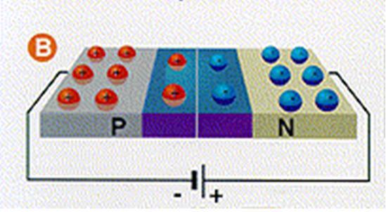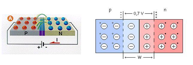 Polarización directa Cuando se juntan los semiconductores tipo P y tipo N, forman lo que se conoce como diodo semiconductor, justo en la frontera de los dos materiales se forma la unión PN y en esa unión se forma una área conocida como zona de Depleción, que es una barrera de potencial equivalente a 0.3V cuando es material es Ge y de 0.7V cuando se usa Si; Para polarizar en sentido directo esta unión se conecta el potencial positivo de la fuente en el material P y el potencial negativo en el material N, en ésta condición, si la tensión de la batería es menor a la barrera de potencial, los electrones no tienen la suficiente energía para atravesar la zona de Depleción y no se genera ningún flujo de corriente a través del diodo, cuando la fuente de alimentación es mayor a la barrera de potencial, los huecos y los electrones son empujados hacia la unión PN recombinándose con los electrones libres y los huecos libres generando un flujo de corriente a través del diodo.