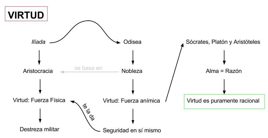 Más tarde, en la época que se describe en la Odisea (siglo VII a.C.), se habla de la nobleza, basada en la aristocracia. Ahora el virtuoso o el noble es el fuerte. Pero esta fuerza no tiene un matiz físico como tenía en la Ilíada, sino un matiz anímico. Es decir, el noble es aquel de alma fuerte, aquel seguro de sí mismo. Esta seguridad te la proporciona la fuerza física. Por eso, la nobleza se basa en la aristocracia. Fueron los filósofos Sócrates, Platón y Aristóteles, los que eliminaron todo componente físico de la virtud, quedándose con el alma. Luego identificaron la fuerza anímica, la nobleza, con la razón. Llegando así, a la conclusión de que la virtud es puramente racional. Este es el paso del mito al logos desde el punto de vista de la continuidad y de la virtud.