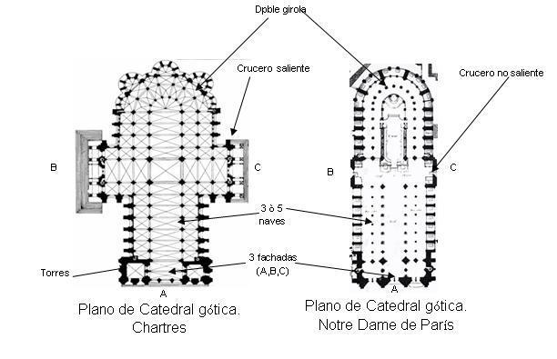 La arquitectura gótica presenta innovaciones técnicas y constructivas notables, que permitieron levantar estructuras esbeltas y ligeras con medios y materiales sencillos. Las principales aportaciones constructivas, al igual que en el románico, se centran en las cubiertas.La planta de las grandes iglesias góticas responde a dos tipos principales: de tradición románica. En él se observan casi las mismas formas que en el estilo románico y más comúnmente la de cruz latina, con girola o sin ella pero con los brazos poco salientes y con los absidiolos o capillas absidiales frecuentemente poligonales. Las iglesias abaciales, sobre todo, cistercienses, siguen este tipo con brazos muy salientes como en la época románica. Y en las iglesias menores o populares se adopta como planta más común la de cruz latina o la rectangular y con un solo ábside poligonal en la cabecera; de salón. La planta carece de crucero de brazos salientes (aunque no deja de ostentarse más o menos la simbólica cruz de enmedio), el templo de salón presenta una disposición basilical y posee, como mínimo, tres naves de igual altura y, por consiguiente, un sistema de iluminación lateral. Los espacios interiores son amplios y desahogados, abarcables con una sola mirada y tremendamente unitarios, de ahí que parezcan o tengan el aspecto de un gran salón. En todo caso, la planta se divide en tramos rectangulares o cuadrados determinados por las columnas y arcos transversales y sobre éstos, cargan las bóvedas de crucería. Desde mediados del siglo XIII se hace común el abrir capillas en los lados de las iglesias, entre los contrafuertes, para satisfacer la devoción de los gremios o cofradías y del pueblo en general, ya que antes de esta época era raro admitirlas fuera de los ábsides.