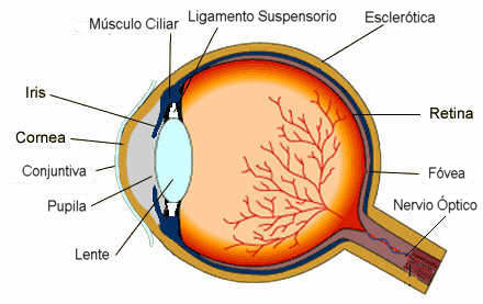 El ojo es el órgano de visión. El ojo tiene una estructura compleja que consiste de un lente que enfoca la luz en la retina. La retina esta cubierta por dos tipos de células fotorreceptoras con formas de bastones y conos.