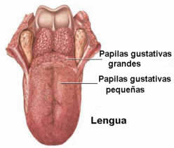 Los receptores para el gusto son las papilas gustativas que se encuentran principalmente en la lengua, pero también están localizadas en el paladar y cerca de la faringe. Las papilas gustativas pueden detectar cuatro gustos básicos: salado, dulce, amargo, y agrio.