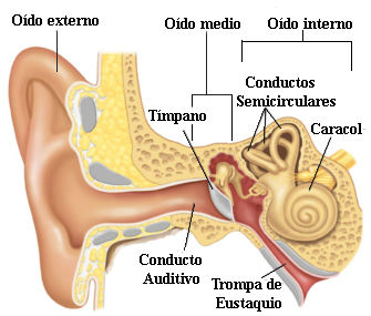 El oído es el órgano de la audición. La oreja forma el oído externo que sobresale de la cabeza en forma de copa para dirigir los sonidos hacia la membrana timpánica. Las vibraciones se transmiten al oído interno a través de varios huesos pequeños situados en el oído medio llamados martillo, yunque y estribo.