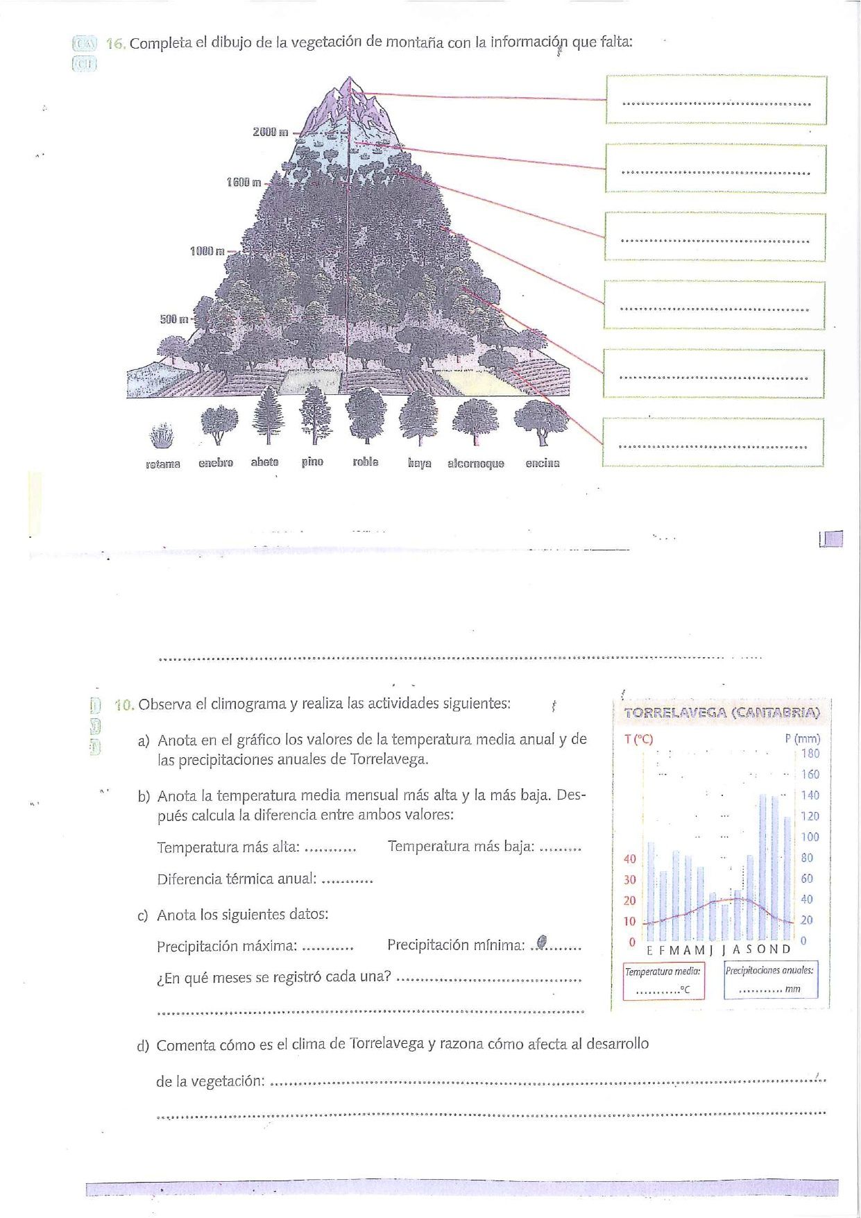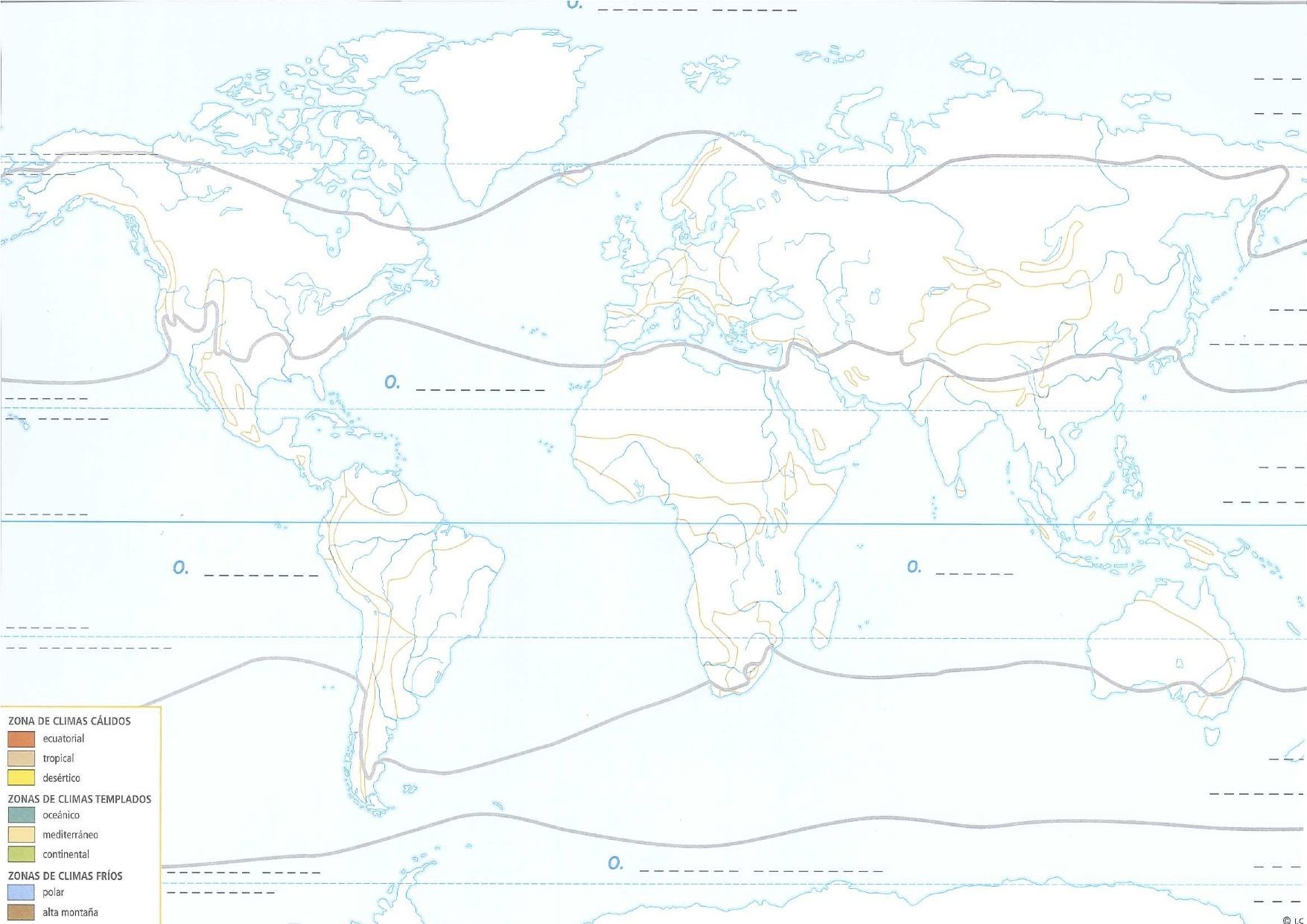 Vocabulario/conceptos sobre el tiempo y el clima: - Zonas climáticas según la latitud. (variaciones en la forma en la que llegan los rayos solares)- Zona Fría: (60o 90o N y S) Los rayos solares inciden de manera muy inclinada, incluso parte del año no se recibe energía solar (noche polar). Temperaturas medias inferior a 0 oC. El clima de esta zona se llama clima polar y junto con el clima de alta montaña componen los climas fríos. Zona Templada: (30o 60o N y S) La inclinación de los rayos solares varía según las estaciones por lo que la temperatura también varía. Temperaturas medias entre 0 oC y 20 oC. Los climas de esta zona son el clima mediterráneo, el chino, el continental y el oceánico. - Zona Cálida: (0o 30o N y S) Los rayos solares inciden durante todo el año de manera directa por lo que las temperaturas son elevadas y apenas varían a lo largo del año (no hay estaciones). Temperaturas medias superiores a 20 oC.Los climas de esta zona son el ecuatorial, el desértico y el tropical (con dos variantes, tropical seco y tropical lluvioso) - Paisaje o espacio natural. El constituido por el medio físico (geografía y clima) y por los seres vivos (vegetación y fauna). Se caracteriza por no haber sido modificado por el hombre. Climograma. Gráfico en el que se representan las precipitaciones (con columnas) y las temperaturas (con líneas) de un lugar determinado. Sirve para identificar los diferentes tipos de climas. - Mes/estación seca. En un climograma aquel cuya línea de temperaturas es superior a su columna de precipitaciones. Amplitud térmica. Diferencia en grados entre el mes con la temperatura mayor y el mes con la menor. Características de cada clima: Climas cálidos: - Clima ecuatorial. Localización: en torno al ecuador. Temperaturas: elevadas durante todo el año. Media superior a 20 o C. Amplitud térmica casi inexistente (menos de 3oC) Precipitaciones: abundantes y regulares durante todo el año. Superiores a 1500 mm. No hay ninguna estación seca. Ríos caudalosos y regulares (con pocas variaciones a lo largo del año): Amazonas y Congo. La vegetación característica de este clima es la selva ecuatorial, bosque denso. Fauna muy variada: simios y aves. Actividad humana: agricultura tradicional itinerante y explotación forestal. - Clima tropical lluvioso. Localización: entre el clima ecuatorial y los trópicos. Temperaturas: elevadas durante todo el año. Media superior a 20 o C. Escasa amplitud térmica. Precipitaciones: Se diferencian dos estaciones, una seca (invierno) y otra lluviosa (verano). Ríos caudalosos y muy regulares. Selva tropical, menos densa con zonas de sabana (hierbas altas y árboles aislados). Fauna muy variada: herbívoros (elefantes, jirafas, rinocerontes, cebras, ñus, etc.) y sus depredadores (hienas, leones, guepardos, etc. ) Actividad humana: agricultura tradicional sedentaria y plantaciones tropicales. - Clima tropical seco. Localización: entre el clima ecuatorial y los trópicos. Temperaturas: inviernos suaves y veranos cálidos. Media anual entre 18o y 20 o C. Escasa amplitud térmica. Precipitaciones: escasas. Ríos caudalosos pero irregulares (con muchas variaciones a lo largo del año). Sabana con zonas de estepa (hierbas bajas y arbustos aislados). Fauna variada: herbívoros (cebras, elefantes, jirafas, rinocerontes, ñus, etc.) y sus depredadores (hienas, leones, guepardos, etc. ) Actividad humana: agricultura tradicional sedentaria y plantaciones tropicales. - Clima desértico. Localización: en torno a los trópicos. Temperaturas: elevadas durante todo el año. Grandes diferencias entre el día y la noche. Media superior a 20 o C. Amplitud térmica superior a 10oC. Precipitaciones: muy escasas durante todo el año, menos de 200 mm.d. No hay ríos. Lechos secos llamados wadis. e. Vegetación escasa y adaptada a este clima. Fauna escasa. f. Actividad humana: pastoreo nómada (tuaregs, beduinos, etc.), agricultura intensiva de regadío, petróleo y gas natural. Climas templados: - Mediterráneo. Localización: fachada occidental de los continentes entre 30o y 40o de latitud norte y Temperaturas: inviernos suaves y veranos calurosos. Media anual entre 10o C y 20o C. Amplitud térmica entre 10 y 15 oC. Precipitaciones: irregulares, llueve en primavera y otoño, entre 400 y 800mm. El verano seco. Los ríos poco caudalosos e irregulares con mínimos en verano: El Turia, el Júcar y el Segura. La vegetación se adapta a la sequía estival y es de hoja perenne. Las principales especies son: la encina, el alcornoque, el pino mediterráneo y una gran variedad de arbustos y matorrales de plantas olorosas como el tomillo, la retama, el romero o la jara. Fauna variada: el lince, el conejo y la perdiz. Actividad humana: agricultura extensiva (trilogía mediterránea) y ganadería intensiva. chino. Localización: en la fachada oriental de los continentes entre 30o y 40o de latitud norte y sur. Temperaturas: inviernos suaves y veranos calurosos. Media anual entre 10o C y 20o C. Amplitud térmica entre 10 y 15 oC. Precipitaciones: llueve durante todo el año (sin estación seca), más en verano (800mm anuales). Ríos: caudal irregular con crecidas en verano. Vegetación de coníferas y selva tropical. Fauna variada. Actividad humana: agricultura de arroz y seda. - Oceánico. Localización: en la fachada occidental de los continentes entre 40o y 60o de latitud N y S. Temperaturas: inviernos suaves y veranos frescos. Media anual entre 5o C y 15o C. Amplitud térmica entre 10 y 15 oC. Precipitaciones: abundantes todo el año, aunque ligeramente menos en verano.Máss de 800 mm. Ríos caudalosos y regulares: el Rin, el Sena o el Támesis. Bosques de hoja caduca, como los robles, las hayas, los arces y los castaños. Matorrales adaptados a la humedad (landa) y praderas. Fauna variada. Actividad humana: ganadería. - Continental. Localización: en el interior de los continentes del hemisferio norte. Temperaturas: inviernos muy fríos y ve