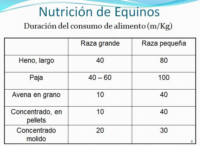 Principios de la ración Proveer por lo menos 0.5 kg de material fibroso (heno o paja) por cada 100 Kg de peso corporal. Para mantener ocupado al animal masticando, producción de saliva y salud dental. El material vegetativo muy pequeño (menos de 2mm) no estimula el peristaltismo. No más de 0.4 Kg de alimento balanceado/100Kg de PC/Tiempo de comida y esos alimentos deben ser de alta calidad higiénica. No sobrepasar la capacidad de consumo del animal (expresado en MS/100Kg de PC)