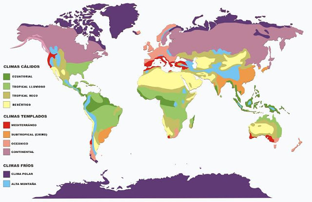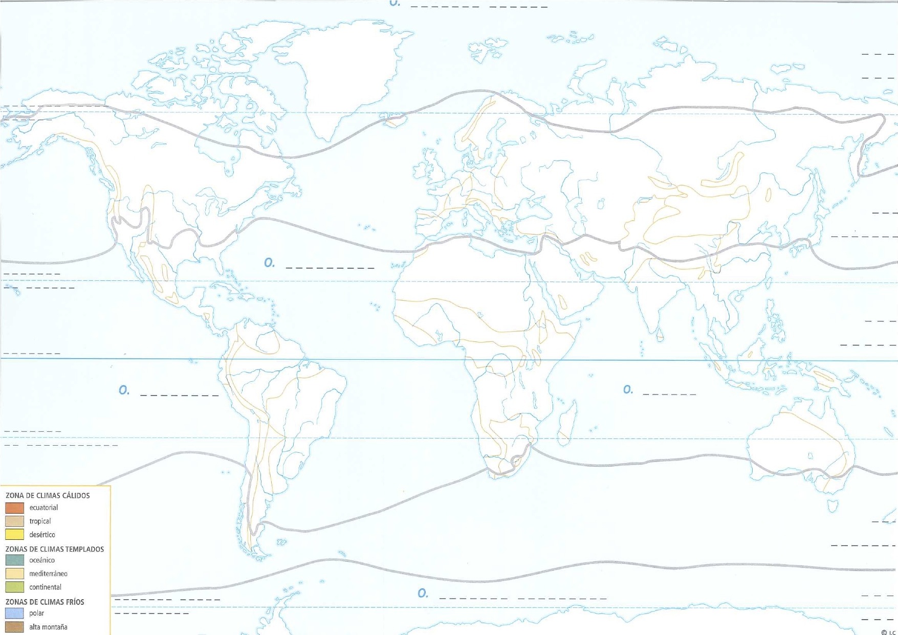 Vocabulario/conceptos sobre el tiempo y el clima: Zonas climáticas según la latitud. (variaciones en la forma en la que llegan los rayos solares) Zona Fría: (60o 90o N y S) Los rayos solares inciden de manera muy inclinada, incluso parte del año no se recibe energía solar (noche polar). Temperaturas medias inferior a 0 oC. El clima de esta zona se llama clima polar y junto con el clima de alta montaña componen los climas fríos. Zona Templada: (30o 60o N y S) La inclinación de los rayos solares varía según las estaciones por lo que la temperatura también varía. Temperaturas medias entre 0 oC y 20 oC. Los climas de esta zona son el clima mediterráneo, el chino, el continental y el oceánico. Zona Cálida: (0o 30o N y S) Los rayos solares inciden durante todo el año de manera directa por lo que las temperaturas son elevadas y apenas varían a lo largo del año (no hay estaciones). Temperaturas medias superiores a 20 oC.Los climas de esta zona son el ecuatorial, el desértico y el tropical (con dos variantes, tropical seco y tropical lluvioso) Paisaje o espacio natural. El constituido por el medio físico (geografía y clima) y por los seres vivos (vegetación y fauna). Se caracteriza por no haber sido modificado por el hombre. Climograma. Gráfico en el que se representan las precipitaciones (con columnas) y las temperaturas (con líneas) de un lugar determinado. Sirve para identificar los diferentes tipos de climas. Mes/estación seca. En un climograma aquel cuya línea de temperaturas es superior a su columna de precipitaciones. Amplitud térmica. Diferencia en grados entre el mes con la temperatura mayor y el mes con la menor. Características de cada clima: Climas cálidos: Clima ecuatorial. Localización: en torno al ecuador. Temperaturas: elevadas durante todo el año. Media superior a 20 o C. Amplitud térmica casi inexistente (menos de 3oC) Precipitaciones: abundantes y regulares durante todo el año. Superiores a 1500 mm. No hay ninguna estación seca. Ríos caudalosos y regulares (con pocas variaciones a lo largo del año): Amazonas y Congo. La vegetación característica de este clima es la selva ecuatorial, bosque denso. Fauna muy variada: simios y aves. Actividad humana: agricultura tradicional itinerante y explotación forestal. Clima tropical lluvioso. Localización: entre el clima ecuatorial y los trópicos. Temperaturas: elevadas durante todo el año. Media superior a 20 o C. Escasa amplitud térmica. Precipitaciones: Se diferencian dos estaciones, una seca (invierno) y otra lluviosa (verano). Ríos caudalosos y muy regulares. Selva tropical, menos densa con zonas de sabana (hierbas altas y árboles aislados). Fauna muy variada: herbívoros (elefantes, jirafas, rinocerontes, cebras, ñus, etc.) y sus depredadores (hienas, leones, guepardos, etc. ) Actividad humana: agricultura tradicional sedentaria y plantaciones tropicales. Clima tropical seco. Localización: entre el clima ecuatorial y los trópicos. Temperaturas: inviernos suaves y veranos cálidos. Media anual entre 18o y 20 o C. Escasa amplitud térmica. Precipitaciones: escasas. Ríos caudalosos pero irregulares (con muchas variaciones a lo largo del año). Sabana con zonas de estepa (hierbas bajas y arbustos aislados). Fauna variada: herbívoros (cebras, elefantes, jirafas, rinocerontes, ñus, etc.) y sus depredadores (hienas, leones, guepardos, etc. ) Actividad humana: agricultura tradicional sedentaria y plantaciones tropicales. Clima desértico. Localización: en torno a los trópicos. Temperaturas: elevadas durante todo el año. Grandes diferencias entre el día y la noche. Media superior a 20 o C. Amplitud térmica superior a 10oC. Precipitaciones: muy escasas durante todo el año, menos de 200 mm.d. No hay ríos. Lechos secos llamados wadis. e. Vegetación escasa y adaptada a este clima. Fauna escasa. f. Actividad humana: pastoreo nómada (tuaregs, beduinos, etc.), agricultura intensiva de regadío, petróleo y gas natural. Climas templados: Mediterráneo. Localización: fachada occidental de los continentes entre 30o y 40o de latitud norte y Temperaturas: inviernos suaves y veranos calurosos. Media anual entre 10o C y 20o C. Amplitud térmica entre 10 y 15 oC. Precipitaciones: irregulares, llueve en primavera y otoño, entre 400 y 800mm. El verano seco. Los ríos poco caudalosos e irregulares con mínimos en verano: El Turia, el Júcar y el Segura. La vegetación se adapta a la sequía estival y es de hoja perenne. Las principales especies son: la encina, el alcornoque, el pino mediterráneo y una gran variedad de arbustos y matorrales de plantas olorosas como el tomillo, la retama, el romero o la jara. Fauna variada: el lince, el conejo y la perdiz. Actividad humana: agricultura extensiva (trilogía mediterránea) y ganadería intensiva. chino. Localización: en la fachada oriental de los continentes entre 30o y 40o de latitud norte y sur. Temperaturas: inviernos suaves y veranos calurosos. Media anual entre 10o C y 20o C. Amplitud térmica entre 10 y 15 oC. Precipitaciones: llueve durante todo el año (sin estación seca), más en verano (800mm anuales). Ríos: caudal irregular con crecidas en verano. Vegetación de coníferas y selva tropical. Fauna variada. Actividad humana: agricultura de arroz y seda. Oceánico. Localización: en la fachada occidental de los continentes entre 40o y 60o de latitud N y S. Temperaturas: inviernos suaves y veranos frescos. Media anual entre 5o C y 15o C. Amplitud térmica entre 10 y 15 oC. Precipitaciones: abundantes todo el año, aunque ligeramente menos en verano.Máss de 800 mm. Ríos caudalosos y regulares: el Rin, el Sena o el Támesis. Bosques de hoja caduca, como los robles, las hayas, los arces y los castaños. Matorrales adaptados a la humedad (landa) y praderas. Fauna variada. Actividad humana: ganadería. Continental. Localización: en el interior de los continentes del hemisferio norte. Temperaturas: inviernos muy fríos y veranos cálidos. Grandes