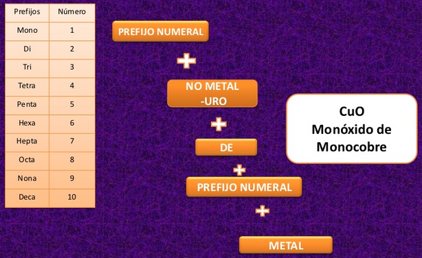 Se llama también Nomenclatura IUPAC, para esta nomenclatura se tiene en cuenta el número de átomos presentes de cada elemento y para ello se usan prefijos numéricos excepto para indicar que el primer elemento de la fórmula sólo aparece una vez (mono) o cuando no puede haber confusión posible debido a que tenga una única valencia.