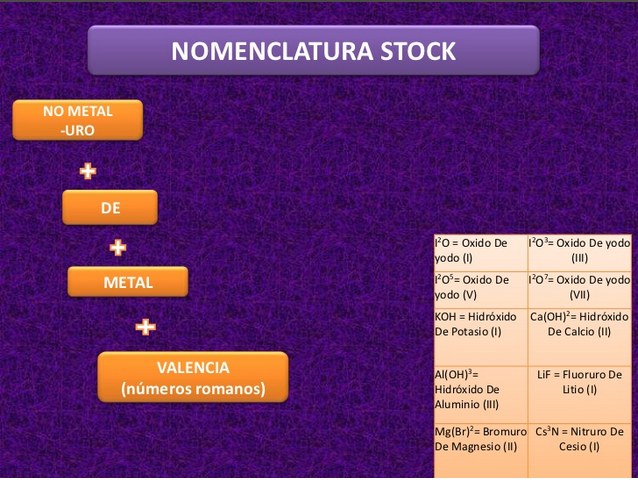Esta nomenclatura tiene en cuenta los valores de los estados de oxidación positivos (es decir sólo de los elementos metálicos), los cuales se expresan en la Funcion Química correspondiente en numeración romana encerrada entre paréntesis, (a menos que la expresión matemática de la fórmula se haya simplificado es posible determinar el valor de oxidación por el número subíndice de la derecha).