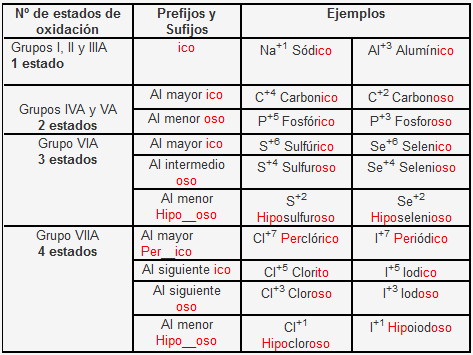 Para los Óxidos, Hidróxidos y Ácidos Oxácidos tiene en cuenta el número de estados de oxidación de los elementos de tal forma: