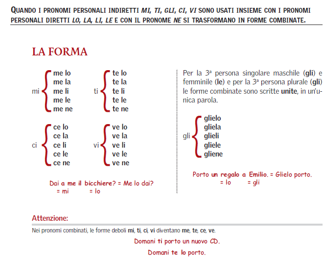 I pronomi MI, TI, CI, VI, SI quando sono seguiti da un altro pronome, cambiano in: ME, TE, CE, VE, SE. Inoltre LE (femminile singolare) e GLI diventano GLIE-. Queste forme possono essere seguite dai pronomi LO, LA, LI, LE, NE, dando origine alle seguenti forme: ME LO, TE LA, SE LI, CE LE, VE NE ecc. Osservare la seguente tabella: