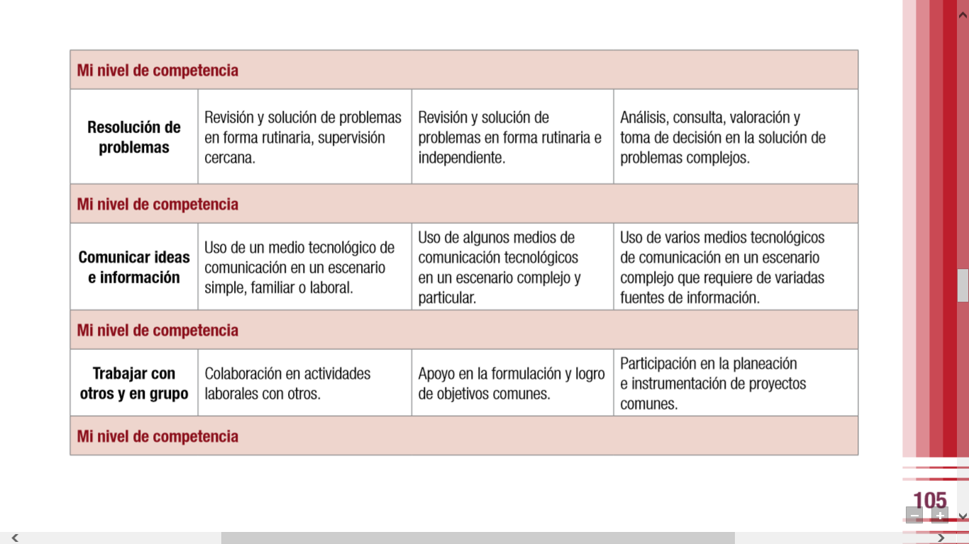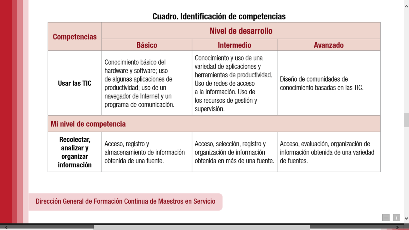CONSIDERO QUE ME ENCUENTRO EN UN NIVEL MEDIO DE LAS COMPETENCIAS.¿Qué cambios han tenido que realizar en su profesión docente para incorporar las TIC a su práctica diaria? En primer lugar contratar servicio de Internet para poder realizar las tareas que se requieren llevar a cabo en la escuela, claro todo eso como alumna, ya que aun no somos docentes, pero me imagino que si se necesita incorporar las tics a la practica en las aulas es necesario primero ver que como docentes nos estemos actualizando en cuanto a las nuevas tecnologías para saber manejar nuevos programas.¿Qué estrategias formativas se requerirán para adquirir, desarrollar o fortalecer las competencias antes señaladas? Opino que el estar en contacto con las actividades que orillen a desarrollar esas competencias es lo más indicado e involucrarse en el uso de las tics de una manera diferente y más avanzada de lo que estemos acostumbrados. ¿Qué estrategias se podrían implementar para favorecer el desarrollo de estas competencias en los alumnos, en los docentes, en los directivos y, en caso de existir, en los encargados de aulas con equipos tecnológicos? Que las clases sean más dinámicas, que se trabaje más colaborativamente, insertar la variedad de recursos que nos ofrecen las tics para trabajar en clases con los alumnos, que existan más cursos por Internet de actualización.