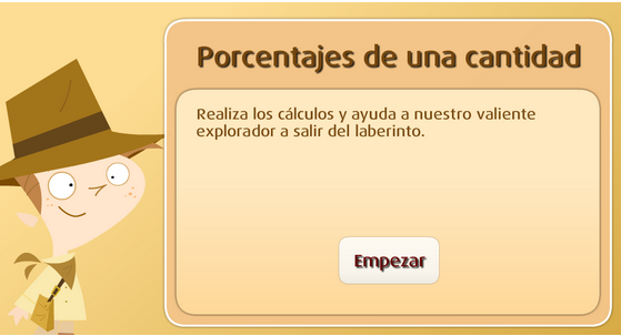 2) Ingresa a la siguiente página y realiza los ejercicios que aparecen allí:http://ntic.educacion.es/w3//eos/MaterialesEducativos/mem2008/visualizador_decimales/porcentajes.html 3) Laberinto : En la siguiente página debes ayudar al explorador a salir del laberinto. http://www.primaria.librosvivos.net/archivosCMS/3/3/16/usuarios/103294/9/6EP_Mate_cas_ud8_Porcentaje/frame_prim.swf