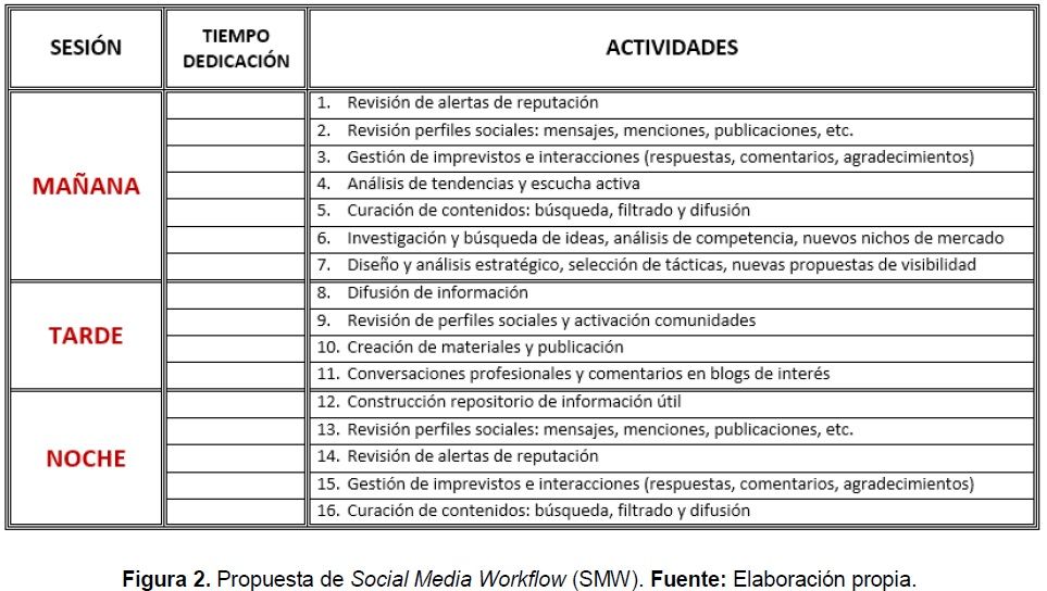 El Plan Social Media (PSM en adelante) sirve para: reforzar la presencia virtual responder a ataques o solventar obstáculos, facilitar la comunicación interna y la consecución de los objetivos marcados optimizando el rendimiento -en dinero y uso de recursos- del tiempo dedicado a las actuaciones Social Media. Ha de permitir configurar un ecosistema de trabajo organizado (Social Media Framework, SMF) que integrará las diferentes técnicas y actuaciones, herramientas y aplicaciones que se usen para gestionar eficazmente la reputación online. En este enlace se puede observar el esquema de una SMF para una organización compleja.Para aplicar las herramientas allí contenidas y desarrollar las actuaciones con orden, se recomienda construir el cronograma denominado “Flujo de trabajo diario en SM” (Social Media Workflow, SMW) como el que se propone aquí:
