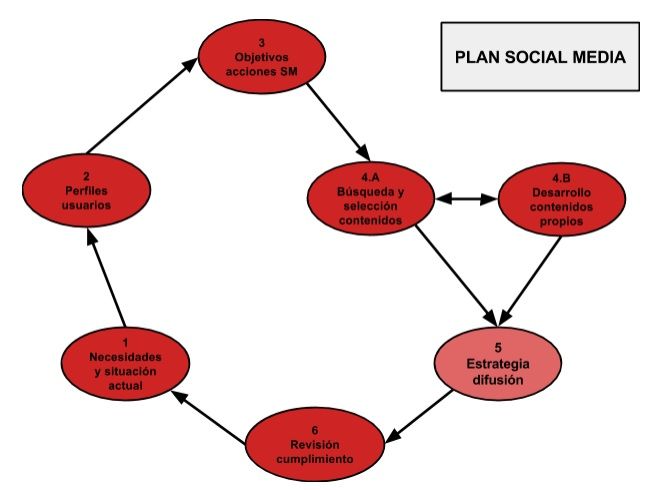 4. Estrategia de contenidos:“El contenido es el rey” es una de las frases más típicas en el ámbito del Community Management. Dos posibilidades complementarias:4.1. Desarrollo de contenidos adecuados al público objetivo identificado y a la consecución de las metas marcadas: la creación de contenidos propios pone de manifiesto nuestro dominio del área profesional en la que nos movemos; de hecho son nuestra mejor tarjeta de presentación ya que expone nuestra creatividad y carácter innovador, el nivel de calidad y filosofía de trabajo.4.2. Búsqueda y selección de contenidos de interés: información externa (de especialistas en esos campos) que se revisa y se usa como andamiaje o complemento de nuestra aportación personal. Este tipo de comunicación manifiesta nuestro nivel de conocimiento del entorno profesional en el que nos movemos, el deseo de actualización y mejora continua, así como el grado de cercanía con las nuevas tendencias o las investigaciones punteras en dichos campos.Para ello será importante identificar nuestro capital intangible (nuestros expertos) y determinar cómo puede aprovecharse y ser involucrado en el proceso; establecer cuáles son las vías mediante las que se genera conocimiento en la compañía; descubrir las fuentes de conocimiento externo a las que debe recurrir nuestra marca (profesionales de referencia, asociaciones empresariales, instituciones y otras organizaciones públicas); concretar el espacio en el que radica el aporte original, innovador y específico de nuestra marca, en esta área encontraremos el manantial de nuestra ventaja competitiva y permitirá desarrollar contenidos específicos; seleccionar los canales óptimos para transferir ese conocimiento y facilitar su absorción por el público objetivo de tal manera que se asegure su comprensión y se induzca el comportamiento o conducta deseados.Según los estudios en el campo del marketing y la publicidad corporativa, para conseguir llegar sin problemas a todos los tipos de público y transmitir el mensaje deseado, es preciso que los contenidos publicitarios o promocionales cumplan unas características: o ser breve y conciso, contener un mensaje claro e ir directo a su objetivo, provocar y llamar a la acción además de ser atrayente y amigable, aprovechar las ventajas de las herramientas multimedia (recurrir al vídeo, audio o las presentaciones interactivas facilitará que se supere el “ruido” característico de los ecosistemas Social Media y que capte el interés) de hecho tienen un ROI mucho mayor que los mensajes transmitidos en mensajes de texto o envíos tradicionales por mail con documentación adjunta, aportar una nota de creatividad u originalidad que atraiga la atención y favorezca una conexión emocional con el usuario añadir valor a lo que ya sabe la audiencia objetivo (nueva información, uso alternativo, ventajas complementarias de su aplicación, etc.) considerar la accesibilidad en su diseño y concepción para ser inclusivo si es contenido textual exclusivamente, habrán de ser mensajes breves que incluyan enlaces a páginas de destino corporativas en los que el usuario pueda encontrar información adicional al mismo tiempo que se siente inmerso en un universo coherente con la imagen de marca. Regla del Cinco: un cierto trabajo debería aportar Una serie de entradas monotemáticas en el blog corporativo, Una infografía sobre buenas prácticas Varias presentaciones multimedia (combinando transparencias con audio) Un webinario o videoconferencia en directo Componer varios mails con información relevante para listas de contactos específicos.