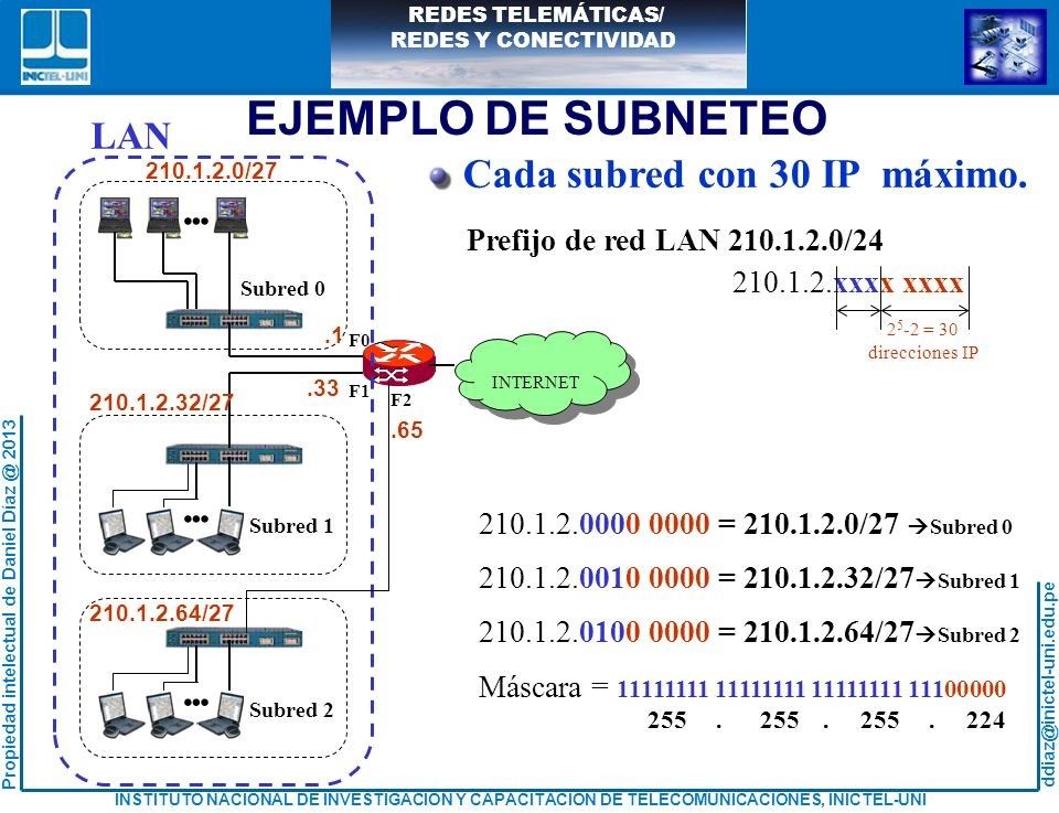 Formato de Dirección IPUna dirección IP (Protocolo Internet) es una serie de cuatro números que se utilizan para identificar exclusivamente un cliente o sistema principal, Cada dirección IP contiene una parte de red y una parte de sistema principal. La parte de la dirección correspondiente a la red direcciona un datagrama a la red correcta. Una vez vez llega el datagrama a la red, IP utiliza la parte de sistema principal para direccionar el datagrama al sistema principal correcto la dirección IP siempre se especifica conjuntamente con su mascara de subred.Cómo descifrar una dirección IPUna dirección IP es una dirección de 32 bits, escrita generalmente con el formato de 4 números enteros separados por puntos. Una dirección IP tiene dos partes diferenciadas: los números de la izquierda indican la red y se les denomina netID (identificador de red). los números de la derecha indican los equipos dentro de esta red y se les denomina host-ID Direcciones IP especiales Las direcciones IP con todos sus bits 1 y con todos sus bits 0 son reservadas. Son direcciones en las que la parte de la red y la parte de sistema principal de la dirección son todos unos binarios (todos bits 1) o todos ceros binarios (todos bits 0). Una dirección de bucle de retorno es la dirección con 127.0.0.1. La información que se envía a esta dirección nunca abandona el sistema principal. Si se utiliza el mandato ping en esta dirección se comprobará la capacidad de respuesta del procesador de entrada/salida y de la pila TCP del AS/400. direcciones Internet privadas. Estas direcciones no son exclusivas y no se definen en los direccionadores Internet externos. difusión limitada es una dirección IP en la que se establecen en 1 todos sus bits Las difusiones limitadas sólo son aplicables a la red física. Los paquetes que se dirigen a la dirección de difusión limitada no se reenvían. difusión dirigida es una dirección IP con un ID de red y un ID de sistema principal válidos que tienen todos sus bits establecidos (son todos 1). El objetivo de dividir las direcciones IP en tres clases A, B y C es facilitar la búsqueda de un equipo en la red. De hecho, con esta notación es posible buscar primero la red a la que uno desea tener acceso y luego buscar el equipo dentro de esta red. Por lo tanto, la asignación de una dirección de IP se realiza de acuerdo al tamaño de la red.Clase Cantidad de redes posibles Cantidad máxima de equipos en cada unaA 12616777214B 1638465534C 2097152254Las direcciones de clase A se utilizan en redes muy amplias, mientras que las direcciones de clase C se asignan, por ejemplo, a las pequeñas redes de empresas.SUBTENEOSubnetear (subnetting) es la acción de tomar un rango de direcciones IP donde todas las IPS sean locales unas con otras y dividirlas en diferentes rangos, o subnets, donde las direcciones IPS de un rango serán remotas de las otras direcciones. Es dividir una red primaria en una serie de subredes, de tal forma que cada una de ellas va a funcionar luego, a nivel de envio y recepcion de paquetes, como una red individual, aunque todas pertenezcan a la misma red principal y por lo tanto, al mismo dominio. Cuando trabajamos con una red pequeña no encontramos muchos problemas para configurar el rango de direcciones IP para conseguir un rendimiento óptimo. Pero a medida que se van agregando host a la red, el desempeño empieza a verse afectado. Esto puede ser corregio, en parte, segmentando la red con switches, reduciendo los Dominios de colision (host que comparten el mismo medio) enviando las tramas solo al segmento correcto. Pero aunque se reducen las colisiones con tomar estas medidas, si se continúa aumentando el número de host, aumentan tambien los envios de broadcast (Envio de paquetes a todos los dispositivos de la red). Lo que afecta considerablemente el desempeño de la red. Esto se debe a que los Switches solo segmentan a nivel de MAC Address y los envios de broadcast son a nivel de red 255.255.255.255 . Es aqui donde el Subneteo nos ayuda. Subneteando la red tendremos, en su conjunto, una sola IP address divida en varias subredes más pequeñas bien diferenciadas, consiguiendo un mayor control y reduciendo el congestionamiento por los broadcast. Clases de subredes. Direcciones en redes ip El protocolo de IP usa direcciones de IP para identificar los HOST y encaminar los datos hacia ellos. todos los host o nodos deben tener una direccion IP unica para poder ser identificados en la red. el nombre de host se traduce a su direccion de IP consultando el nombre en una base de datos de pares nombre - direccion. Cuando se diseñaron las direcciones de IP, nadie se imagino que llegase a existir millones de IP, nadie se imagino que llegase a existir millones de computadores en el mundo y que muchas de estas requeriria una direccion IP para ser identificadas. Los diseñadores pensaron que tenian que satisficadas. los diseñadores pensaron que tenia que satisfacer las necesidades de un modesto puñado de universidades, entidades gubernamentles e institucionales militares. Formatos de direcciones IP Una direccion de IP tiene un formato de dos partes que son la direccion de red y la direccion local. la direccion local. La direccion de redidentifica la red a la que esta conectado el nodo. La direccion local identifica a un nodo particular dentro de la red de una organizacion. Todas las computadoras deben tener una direccion de IP unica en el rango de sistemas con los que se comunica. Clases de direcciones Existen tres tipos de direcciones que son: Clase A para redes muy grandes. Clases B para redes de tamaño medio. Clases C para redes pequeñas. En los inicios de la Internet, a las organizaciones con redes muy grandes, como la marina de los estados unidos o digital equipament Corporation, se les concedia rangos de direcciones IP de clase (A). La parte de red de una direccion de clase (A) tiene una longitud de un octeto.Existen muy pocas direcciones de clase (A) y la