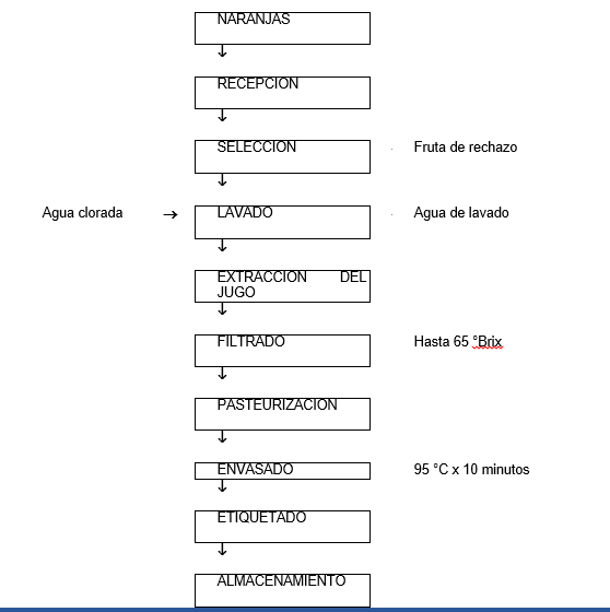 PROCESAMIENTO DE FRUTAS Y VERDURAS JUGOS, NÉCTARES Y COMPOTAS JUGO DE NARANJA · DESCRIPCIÓN DEL PRODUCTO Y DEL PROCESOS · MATERIA PRIMA E INGREDIENTES · INSTALACIONES Y EQUIPOS · DIAGRAMA DE FLUJO · DESCRIPCIÓN DEL PROCESO · CONTROL DE CALIDAD · OTROS ASPECTOS · BIBLIOGRAFÍA DESCRIPCIÓN DEL PRODUCTO Y DEL PROCESO El jugo, es la parte líquida de la fruta que se obtiene por la aplicación de presión sobre ésta. Los jugos se elaboran a partir de frutas cítricas, manzanas, uvas y piña. El jugo de naranja es el que se más se elabora en el mundo y su valor nutritivo radica en su alto contenido de vitamina C. Para obtener un jugo de naranja de alta calidad es recomendable usar fruta fresca, no obstante en la mayoría de las industrias el jugo se elabora a partir de una base concentrada que es más fácil de conservar y manipular. Además se le agrega azúcar para bajar costos de producción. La conservación del jugo de naranja natural se lleva a cabo por el tratamiento con calor (pasteurización), la asepsia durante la preparación y llenado, la baja acidez del producto, y la conservación en ambientes refrigerados.. El proceso de elaboración de jugo de naranja a partir de fruta fresca, consiste en seleccionar, lavar y exprimir las naranjas para extraer el jugo. Seguidamente se filtra para separar las semillas y sólidos en suspensión y por último se pasteuriza y llena en envases de vidrio, plástico, hojalata o cartón, según el nivel tecnológico que se tenga. MATERIA PRIMA E INGREDIENTES Naranjas maduras, de variedades dulces y con abundante jugo INSTALACIONES Y EQUIPOS Instalaciones El local debe cumplir con los requisitos de diseño higiénico que exige las autoridades de salud para el procesamiento de alimentos. Debe ser lo suficientemente grande para albergar las siguientes áreas: recepción de la fruta, sala de proceso, sección de empaque, bodega, laboratorio, oficina, servicios sanitarios y vestidor. La construcción debe ser en bloc repellado con acabado sanitario en las uniones del piso y pared para facilitar la limpieza. Los pisos deben ser de concreto recubiertos de losetas o resina plástica, con desnivel para el desagüe. Los techos de estructura metálica, con zinc y cielorraso. Las puertas de metal o vidrio y ventanales de vidrio. Se recomienda el uso de cedazo en puertas y ventanas. Equipo · Balanza · Extractor de jugos · Selladora · Termómetro · Estufa (fuente de calor) · Ollas · Utensilios: cuchillos, paletas, colador, embudo · Botellas de plástico o vidrio DIAGRAMA DE FLUJO PARA JUGO DE NARANJA DIAGRAMA DE FLUJO PARA JUGO DE NARANJA NARANJAS ¯ RECEPCIÓN ¯ SELECCIÓN ® Fruta de rechazo ¯ Agua clorada ® LAVADO ® Agua de lavado ¯ EXTRACCIÓN DEL JUGO ¯ FILTRADO Hasta 65 °Brix ¯ PASTEURIZACIÓN ¯ ENVASADO 95 °C x 10 minutos ¯ ETIQUETADO ¯ ALMACENAMIENTO DESCRIPCION DEL PROCESO El proceso que se explica a continuación es para la elaboración de jugo de naranja, envasado en botellas plásticas y sin adición de preservantes. Recepción: consiste en cuantificar la materia prima que entra al proceso, es necesario usar balanzas limpias y calibradas. Selección: se selecciona fruta madura con la relación °Brix/acidez adecuada. Se desecha la fruta verde, la excesivamente madura o que presente golpes y podredumbres. Lavado: se hace para eliminar bacterias superficiales, residuos de insecticidas y suciedad adherida a la fruta. Se debe utilizar agua clorada. Extracción del jugo: esta operación se puede hacer con una máquina industrial que recibe las naranjas enteras y realiza la extracción y filtración del jugo de una vez. También se puede utilizar un extractor doméstico (eléctrico) o uno manual. Filtrado: el jugo se pasa por un colador de malla fina para separar las semillas y otros sólidos en suspensión. Pasteurizado: el jugo recibe un tratamiento térmico de 65 °C durante 30 minutos (pasteurización). Una vez transcurrido el tiempo, la operación se completa con el enfriamiento rápido del producto hasta una temperatura de 5 °C, a fin de producir un choque térmico que inhibe el crecimiento de los microorganismos que pudieran haber sobrevivido al calor. Envasado: el jugo se llena en envases de plástico, los cuales deben haber sido lavados, enjuagados con agua clorada y etiquetados. Al llenarlos se deja un espacio vacío, llamado espacio de cabeza, que equivale al 10% del tamaño interno del envase. Sellado: la colocación de la tapa puede hacerse manual o mecánicamente, dependiendo del envase y el equipo con que se cuente. Embalaje y almacenado: después de sellado, se procede a colocarle la etiquetilla con la fecha de vencimiento y por último se acomodan los envases en canastas plásticas para su almacenamiento en refrigeración. CONTROL DE CALIDAD En la materia prima Controlar que las frutas a procesar, sean frescas y estén sanas, es decir sin magulladuras, defectos o demasiado verdes. En el proceso Las operaciones de extracción, filtrado, pasteurización y envasado deben realizarse en forma rápida porque el jugo de naranja se oxida fácilmente y se altera el sabor. En el proceso se deben controlar la temperatura y tiempo de pasteurización, así como la temperatura de enfriamiento. En el producto final Verificar la relación °Brix/acidez, así como el color y sabor del jugo.. El producto en almacenamiento El jugo envasado en botellas de plástico y sin adición de preservantes tiene una vida útil en refrigeración de 7 a 10 días. Cuando el jugo se deteriora se vuelve más ácido y el sabor es desagradable. OTROS ASPECTOS ASPECTOS DE COMERCIALIZACIÓN El jugo de naranja natural es más apreciado que los jugos reconstituidos, aunque su precio es un poco más alto. El mercado potencial está a nivel de hoteles, restaurantes y supermercados. BIBLIOGRAFÍA Lama, J; Figueroa, V. Jugo de naranja dulce. Proyecto Comunitario de Conservación de Alimentos, Condimentos y Plantas medicinales. CDR, ANIR, FMC, MINAGRI. La