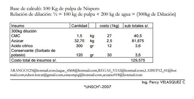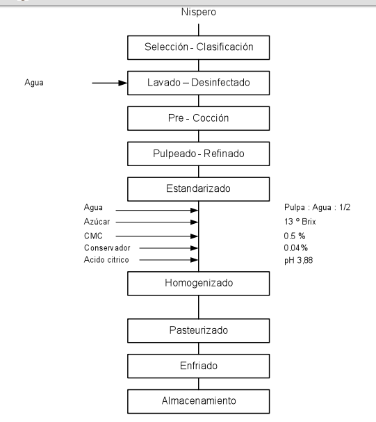 ELABORACION DE NECTARESEn términos generales se puede definir: Jugos: Como su nombre lo indica son jugos extraídos de la fruta, sin ningún ingrediente adicional Néctares: Se espera que normalmente contenga por lo menos un 30% de frutas y se consumen inmediatamente después de abrirlos Concentrados de frutas: Contiene por lo menos 25 % de pulpa de fruta mezclado con almíbar y debe ser diluido con agua, contiene preservantes. Luego de concentrarse tiene apariencia cristalina. En la tecnología de los néctares para la obtención de un producto de buena calidad es importante la necesidad de procesar frutas en óptimas condiciones. La calidad es un conjunto de cualidades inherentes de cada constituyente que no pueden ser modificados. Los factores que determinan las variaciones de la calidad de una fruta son las diferentes condiciones de cultivo, cosecha y las manipulaciones posteriores. MARCO TEORICO Definición de néctar Es el producto constituido por el jugo y/o pulpa de fruta finamente dividida, adicionando agua potable, azúcar, acido orgánico, preservantes químicos y estabilizador si fuera necesario. Algunos requisitos para la elaboración de néctares son los siguientes: *Contenido mínimo de ingredientes de fruta. El producto no deberá contener menos del 30 – 40% en peso de ingredientes de frutas o el equivalente procedente de algún ingrediente cualquiera de fruta concentrada. *Sólidos solubles. El producto no deberá tener menos del 10% en peso de sólidos solubles determinado por refractómetro a 68ºF, no corregido por acidez y leído como ºBrix de las escalas internacionales de sucrosa. *Viscosidad aparente. La viscosidad aparente del producto deberá ser tal que el tiempo del flujo no sea menor de 30 segundos de acuerdos al método de Lamb y Lewis (1959). *Contenido de etanol. No deberá exceder de 3g/Kg. *Hidroximetilfurfural. No deberá exceder de 10 mg/Kg. Ing. Percy VELASQUEZ C “UNSCH”-2007 *Propiedades organolépticas. El producto deberá tener las características de color, aroma y sabor de la fruta de la cual fue elaborado. *Aditivos alimentarios. El acido cítrico y el acido málico pueden ser utilizados como agentes acidificantes y el acido L-ascórbico como un agente antioxidante. *Residuos de pesticidas. El producto deberá acceder a tales requerimientos según lo especificado por el Codex sobre residuos de pesticida *Contaminantes. Estipulaciones siguientes con respecto a los diversos contaminantes que tienen los residuos de pesticidas, con la excepción del nivel de estaño contenido. *Llenado mínimo. El néctar deberá ocupar no menos del 90% de la capacidad de agua en el recipiente. La capacidad de agua en el recipiente es el volumen de agua destilada a 68 ºF que puede contener el recipiente. El néctar deberá estar exento de fragmentos de cáscara, semilla y otras sustancias gruesas y duras. Se permitirá el agregado de acido ascórbico y de vitaminas para su enriquecimiento. No se permite la adición de colorantes artificiales. MATERIALES Y METODOS Materia prima Se utilizara frutas de la estación (Nispero) Insumos utilizados *Azúcar blanca *Acido citrico * Carboxi Metil Celulosa (CMC) *Benzoato de sodio ü Agua potable *Botellas de vidrio * Tapas Equipos y utensilios utilizados *Pulpeadora * Licuadora * Ollas *Cocina * Balanza *Baldes *Cuchillos *Mazo de madera * Termómetro Ing. Procedimiento a) Materia prima: Debe ser de buna calidad, en estado optimo de madurez. b) Pesado: Es importante para determinar los rendimiento c) Lavado: Se hace con el fin de eliminar las materias extrañas que puedan estar adheridas a la fruta. Se puede realizar por inmersión y/o agitación o por rociada. Este ultimo es el mas efectivo. Luego del lavado se recomienda sumergir la fruta en una solución de TEGO 51 al 0.5% por un tiempo no menos de 15 minutos o cualquier otro desinfectante. d) Pelado: Dependiendo de la materia prima, esta operación puede ejecutarse antes o después de la precocción. La mayoría de frutas son sometidas al pulpeado con su cáscara. Esto siempre y cuando se determine que la cáscara no tiene ningún efecto que haga cambiar las condiciones sensoriales de la pulpa o sumo. El pelado se hace empleando maquinas especiales, o en forma manual para lo cual se hace uso de cuchillos de acero inoxidable. e) Pre-cocción: Tiene por objeto ablandar la fruta, facilitando de este modo el pulpeado. Esta operación se realiza en agua a ebullición. La precocción también sirve para inactivar ciertas encimas responsables del pardiamiento, de ser así se estaría hablando de un escaldado. f) Pulpeado: Consiste en presionar la pulpa y así obtener un tamaño adecuado de jugos pulposos. La operación se hace en equipos especiales denominadas pulpeadoras acondicionadas con mallas apropiadas. g) Refinado: La pulpa es pasada a un segunda operación para eliminar toda partícula superior a 1mm de diámetro. Esta actividad se puede realizar en el mismo pulpeador pero previo cambio de tamiz o malla por ejemplo: Nº .5 o menor. h) Estandarizado: Esta operación involucra: regular la dilución pulpa: agua, regular el pH, para lo cual se utiliza acido cítrico; regular los ºBrix con azúcar blanca y adicionar el estabilizante (CMC) y el conservante (Sorbato de sodio o Benzoato de Potasio). i) Molienda Coloidal y/o Homogenizado: Esta operación tiene por objetivo romper las partículas para obtener un producto uniforme. Se puede utilizar un molino coloidal o un homogenizador el cual trabaja a altas presiones j) Pasteurizado: Esta operación es un tratamiento térmico que se realiza para inactivar la carga microbiana que pudiera tener el néctar. Es muy importante tener en cuenta el tiempo y la temperatura de pasteurización. Se puede utilizar un equipo denominado pasteurizador de placas, regulado para trabajar a 97ºC con un tiempo de permanencia del néctar de 30 segundos; o en su defectos ollas para lo cual se debe dejar que el producto llegue a la temperatu