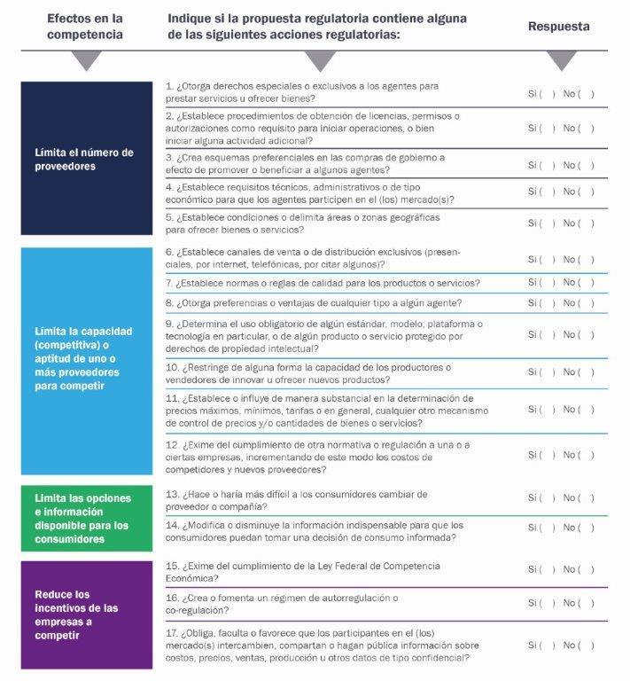 2. Lista de verificación de impacto competitivo Una herramienta útil para identificar posibles efectos de la regulación sobre la competencia es la Lista de Verificación de Impacto Competitivo desarrollada por la Organización para la Cooperación y Desarrollo Económicos (OCDE)[1]. Dicha lista consiste en un cuestionario que tiene el objetivo de ayudar a los servidores públicos a detectar si las disposiciones contenidas en los anteproyectos de regulación y la regulación vigente podrían inhibir la competencia. En caso de que sea así, es importante profundizar en el análisis para determinar si existe la posibilidad de alcanzar los mismos objetivos de política pública mediante una alternativa que minimice el impacto a la competencia. Para más información acerca de cómo contestar la Lista de Verificación de impacto competitivo consulta la Guía completa aquí : Guía de evaluación de la regulación desde la óptica de competencia [1] Ésta ha sido adaptada y adoptada por México a través de la COFEMER en el proceso de mejora regulatoria federal. Esta sección se basa tanto en el cuestionario de la OCDE como en el de COFEMER.