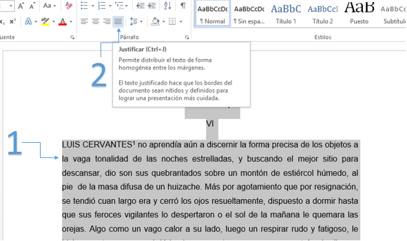 Párrafo: Viñetas: (sin atajo) inicia una lista con viñetas. Numeración: (sin atajo) inicia una lista numerada. Lista multinivel: (sin atajo) inicia una lista de varios niveles. Disminuir sangría: (sin atajo) reduce el nivel de sangría del párrafo. Aumentar sangría: (sin atajo) aumenta el nivel de sangría del párrafo. Alinear texto a la izquierda: (ctrl + Q) alinea el texto a la izquierda. Centrar: (ctrl + T) centrar el texto. Alinear texto a la derecha: (ctrl + D) alinea el texto a la derecha. Justificar: (ctrl + J) alinea el texto en los márgenes izquierdo y derecho y agrega espacios adicionales entre palabras si es necesario. Se crea una apariencia homogénea en los laterales izquierdo y derecho de la página. Espaciado entre lineas y párrafos: (sin atajo) cambia el espacio entre lineas del texto. También puede personalizar la cantidad de espacio agregado antes y después de los párrafos. Sombreado: (sin atajo) colorea el fondo del texto o párrafo seleccionado. Borde inferior: (sin atajo) personaliza los bordes de las celdas o texto seleccionado. Ordenar: (sin atajo) alfabetiza el texto seleccionado u ordena los datos numéricos. Mostrar todo: (ctrl + o) muestra marcas de párrafos y otros símbolos de formato oculto.