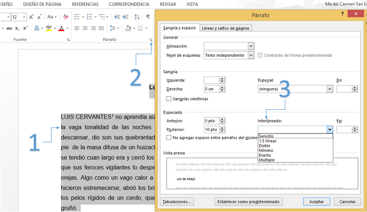 Seleccionar texto. Barra de menú, inicio, párrafo. Interlineado