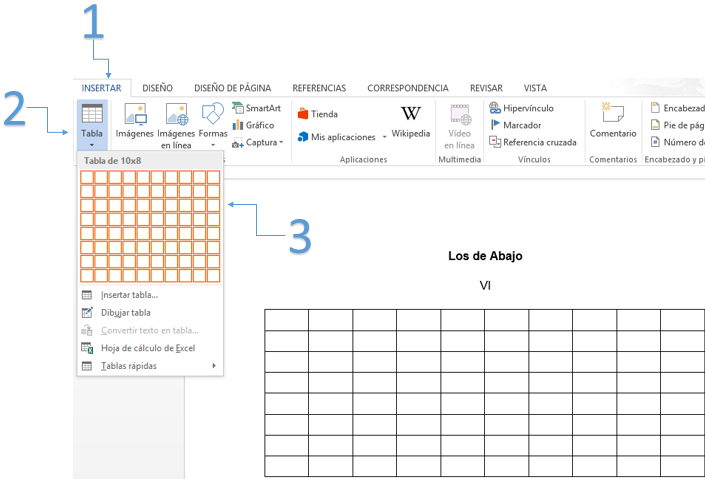 Barra de menú, insertar. Tabla. Seleccionar tabla.