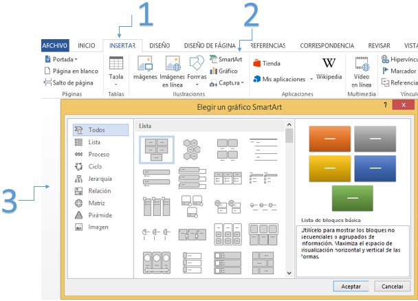 Es una representación visual de la información. Barra de menú, Insertar. SmartArt. Elegir gráfico.