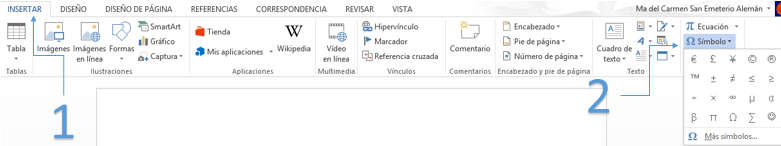 Se utiliza para insertar símbolos que no se encuentran en el teclado, como fracciones, caracteres especiales, puntos suspensivos, caracteres internacionales y símbolos de moneda internacional. Barra de menú, insertar. Símbolo.