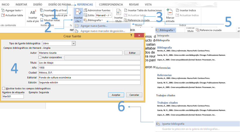 Barra de menú, referencia. Insertar cita. Agregar nueva fuente. Crear fuente. Bibliografía. Insertar bibliografía.
