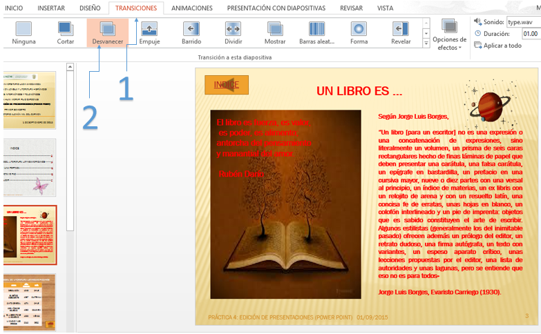 Las transiciones de diapositivas son efectos de tipo animación que se producen en la vista Presentación con diapositivas, cuando pasa de una diapositiva a la siguiente. Puede controlar la velocidad de cada efecto de transición de diapositivas y también agregarle sonido.Barra de menú, transición. Seleccionar transición.