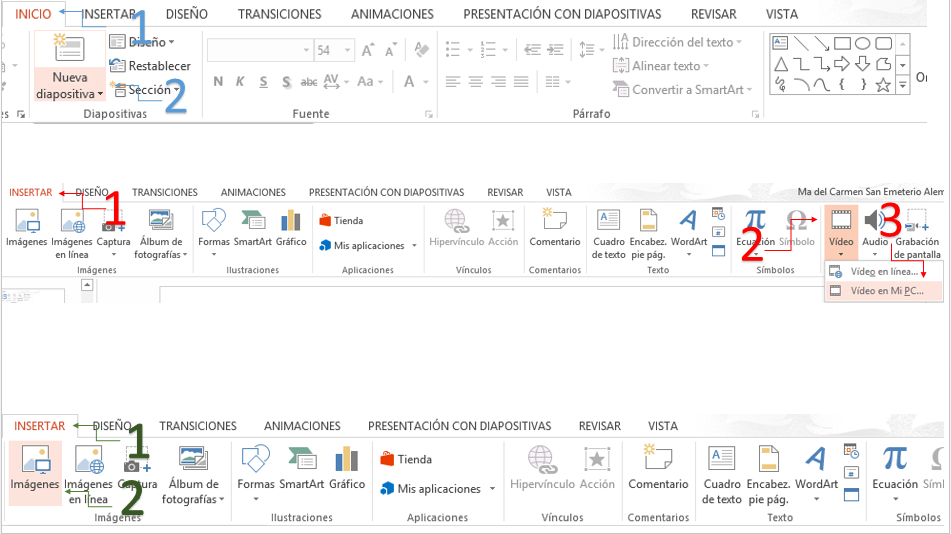 AGREGAR DIAPOSITIVA: Barra de menú, inicio. Nueva diapositiva. AGREGAR VIDEO DESDE ARCHIVO Barra de menú, insertar. Video. Video en mi PC. AGREGAR IMAGEN DESDE ARCHIVO Barra de menú, insertar. Imágenes. AGREGAR FONDO DE DIAPOSITIVA Barra de menú, diseño. Formato del fondo. AGREGAR SMARTART Barra de menú, insertar. SmartArt. AGREGAR TABLA Barra de menú, insertar. Tabla.