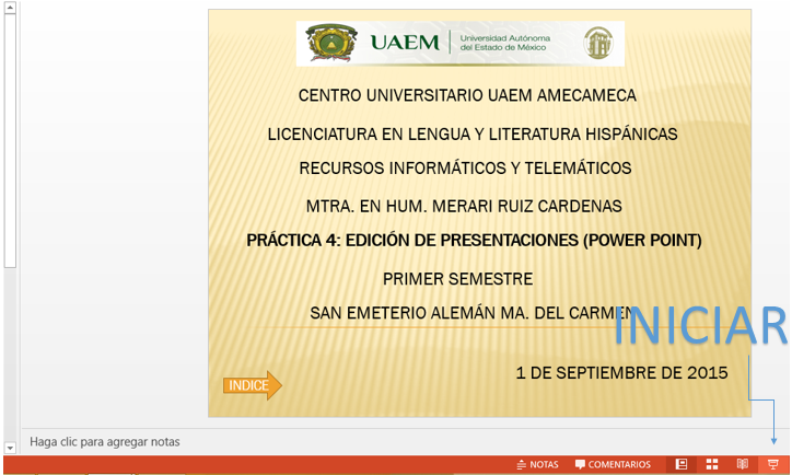 La presentación en diapositivas se inicia con F5, o con la opción "presentación con diapositivas".