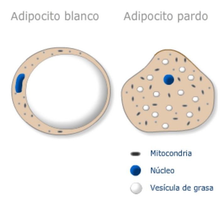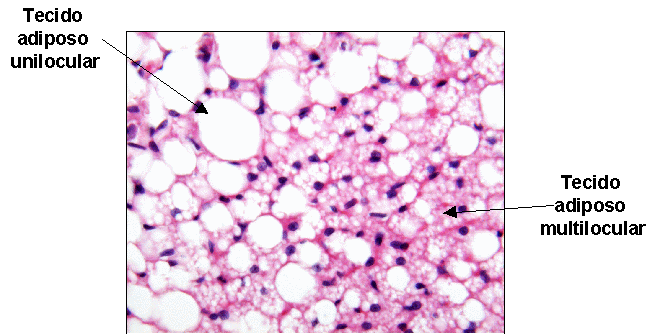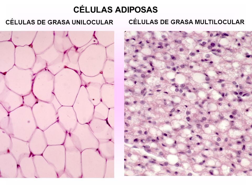 Tejido Adiposo.Jocelyn Aldana Se clasifica en dos tipos, sea que está constituido por adipocitos uniloculares o multiloculares."Tejido adiposo blanco o unilocular"* Cada célula de grasa unilocular contiene una gota de lípido que confiere el tejido adiposo compuesto de estas células un color blanco.* Tiene en abundancia vasos sanguíneos, que forman redes de capilares en todo el tejido* Las membranas plasmáticas de las células adiposas uniloculares contienen receptores para varias sustancias, entre ellas insulina, hormona de crecimiento, noradrenalina y glucocorticoides, que facilitan la captación y liberación de ácidos grasos libres y glicerol.* La grasa unilocular se halla en las capas subcutáneas de todo el cuerpo. También se encuentra en acumulaciones en sitios característicos que dependen del sexo y la edad."Tejido adiposo pardo o multilocular"Está compuesto de células de grasa multiloculares que almacenan grasa en múltiples gotitas.El tejido adiposo pardo es muy vascular por que los vasos se localizan cerca de los adipocitos. En recién nacidos, la grasa parda se localiza en las regionesdel cuello y el área interescapular, debido a que es éste tejido el que los mantiene calientes. El tejido adiposo pardo se vincula con la producción de calor corporal por el gran número de mitocondrias en los adipocitos multiloculares que constituyen este tejido.La termogenina, en las mitocondrias, permite el flujo retrógrado de protones en lugar de utilizarlos para la síntesis de ATP, como resultado del desacoplamiento de la oxidación por la fosforilación, el flujo de protones genera energía que se dispersa como calor.