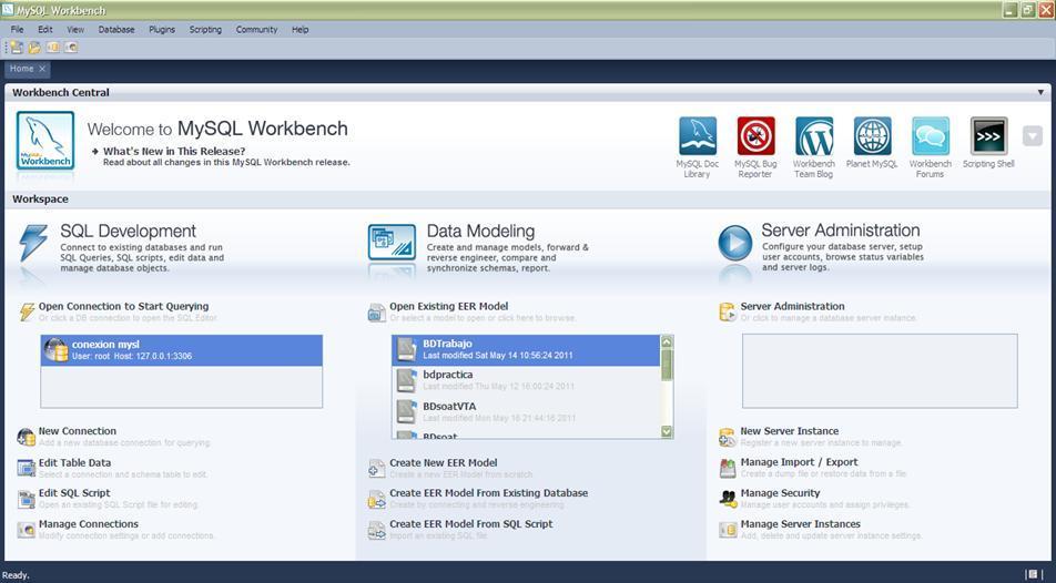 ¿Qué es WorkBench? MySQL Workbench es una aplicación para el diseño y documentación de bases de datos (sucesora de la aplicación DBDesigner4) pensada para ser usada con el sistema de gestión de bases de datos MySQL (recién adquirido por Sun Microsystems). Existen dos versiones del producto, una es open source y la otra es una versión comercial. Evidentemente, la versión comercial proporciona algunas funcionalidades que pueden resultar de interés en algún ámbito, aunque la versión open source es más que suficiente para la realización de prácticas.Características de Workbench Características de Workbeanch• General o Conexión a base de datos & Instance Managemento Wizard driven action itemso Fully scriptable with Python and Luao Soporte para plugins personalizados• Editor de SQL o Schema object browsingo SQL syntax highlighter and statement parsero Multiple-, editable result setso SQL snippets collectionso SSH connection tunnelingo Soporte Unicode• Modelado de datos o Diagrama entidad relacióno Drag'n'Drop visual modelingo Reverse engineering from SQL Scripts and live databaseo Forward engineering to SQL Scripts and live databaseo Sincronización de esquemaVentajas y Desventajas de WorkbenchVentajas1. Brinda libertad a los usuarios.2. Puede ser usado, copiado, estudiado, modificado y redistribuido.3. Ahorros multimillonarios en la adquisición de licencias4. Tiende a ser muy eficiente (por que mucha gente lo optimiza, mejora).Desventajas1. El software libre y el software no-comercial son en realidad incompatibles con el softwarecomercial.2. El software libre crea riesgos legales.3. El software libre no tiene garantía proveniente del autor.4. Disminuye el índice de software”pirata” ¿CÓMO CONSEGUIR LA APLICACIÓN? Existen versiones para Window, Linux y Mac. Hay que tener en cuenta que para los dos últimos sistemas las versiones son Betas. Los links de descarga son los siguientes: Windows y Linux: http://dev.mysql.com/downloads/workbench/5.1.html Mac: http://dev.mysql.com/workbench/?p=182