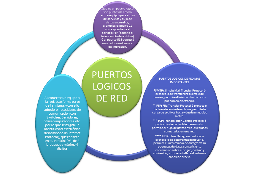 Puertos Lógicos Son "Lugares de conexión lógica". y concretamente, utilizando el protocolo de Internet, la forma en que un programa cliente especifica un programa servidor determinado en una computadora en una red, o dicho de otra manera, son puntos de acceso entre equipos para el uso de servicios y flujo de datos entre ellos.Existen dos tipos:Puertos Físicos de Red: permiten la interconexión de computadoras por medio de cables.Puerto RJ45.- para red local (LAN) vía cable par trenzado con velocidad de Puerto RJ11.- para red telefónica via cable telefónico con velocidad Puerto de red BNC.-LAN via cable coaxial con velocidad de Puerto de red DB15.- (en desuso) via cable de 15 pines, con velocidad Puertos Lógicos de Red: suelen estar numerados "para de esta forma poder identificar la aplicación que lo usa. La implementación del protocolo en el destino utilizará ese número para decidir a qué programa entregará los datos recibidos. Originalmente estos números de puertos fueron usados solo por TCP y UDP, pero ahora también los utilizan SCTP y DCCP. Estos protocolos pertenecen al cuarto nivel del modelo OSI, encargados de la transferencia libre de errores de los datos entre el emisor y el receptor, aunque no estén directamente conectados, así como de mantener el flujo de la red. Protocolo TCP/IP Se han desarrollado diferentes familias de protocolos para comunicación por red de datos para los sistemas UNIX. El más ampliamente utilizado es el Internet Protocol Suite, comúnmente conocido como TCP / IP.Es un protocolo DARPA que proporciona transmisión fiable de paquetes de datos sobre redes. El nombre TCP / IP Proviene de dos protocolos importantes de la familia, el Transmission Contorl Protocol (TCP) y el Internet Protocol (IP). Todos juntos llegan a ser más de 100 protocolos diferentes definidos en este conjunto.El TCP / IP es la base del Internet que sirve para enlazar computadoras que utilizan diferentes sistemas operativos, incluyendo PC, minicomputadoras y computadoras centrales sobre redes de área local y área extensa. TCP / IP fue desarrollado y demostrado por primera vez en 1972 por el departamento de defensa de los Estados Unidos, ejecutándolo en el ARPANET una red de área extensa del departamento de defensa. Formato de direccionamiento IP Los equipos comunican a través de Internet mediante el protocolo IP (Protocolo de Internet). Este protocolo utiliza direcciones numéricas denominadas direcciones IP compuestas por cuatro números enteros (4 bytes) entre 0 y 255, y escritos en el formato xxx.xxx.xxx.xxx. Por ejemplo, 194.153.205.26 es una dirección IP en formato técnico.Los equipos de una red utilizan estas direcciones para comunicarse, de manera que cada equipo de la red tiene una dirección IP exclusiva.El organismo a cargo de asignar direcciones públicas de IP, es decir, direcciones IP para los equipos conectados directamente a la red pública de Internet, es el ICANN (Internet Corporation for Assigned Names and Numbers) que remplaza el IANA desde 1998 (Internet Assigned Numbers Agency).Conjunto de protocolos de red en los que se basa Internet y que permiten la transmisión de datos entre redes de computadoras. En ocasiones se le denomina conjunto de protocolos TCP/IP, en referencia a los dos protocolos más importantes que la componen: Protocolo de Control de Transmisión (TCP) y Protocolo de Internet (IP), que fueron los dos primeros en definirse, y que son los más utilizados de la familia. Existen tantos protocolos en este conjunto que llegan a ser más de 100 diferentes, entre ellos se encuentra el popular HTTP (HyperText Transfer Protocol), que es el que se utiliza para acceder a las páginas web, además de otros como el ARP (Address Resolution Protocol) para la resolución de direcciones, el FTP(File Transfer Protocol) para transferencia de archivos, y el SMTP (Simple Mail Transfer Protocol) y el POP (Post Office Protocol) para correo electrónico, TELNET para acceder a equipos remotos, entre otros. Clases de Subredes Mecanismos de la división en subredesLas clases de direcciones IP ofrecen de 256 a 16,8 millones de Hosts, como se vio con anterioridad. Para administrar de forma eficiente un número limitado de direcciones IP, todas las clases pueden subdividirse en subredes más pequeñas. Introducción y razones para realizar subredesPara crear la estructura de subred, los bits de host se deben reasignar como bits de subred. Este proceso es a veces denominado "pedir bits prestados". Sin embargo, un término más preciso sería "prestar" bits. El punto de inicio de este proceso se encuentra siempre en el bit del Host del extremo izquierdo, aquel que se encuentra más cerca del octeto de red anterior.Las direcciones de subred incluyen la porción de red Clase A, Clase B o Clase C además de un campo de subred y un campo de Host. El campo de subred y el campo de Host se crean a partir de la porción de Host original de la dirección IP entera. Esto se hace mediante la re asignación de bits de la parte de host a la parte original de red de la dirección. La capacidad de dividir la porción de Host original de la dirección en nuevas subredes y campos de Host ofrece flexibilidad de direccionamiento al administrador de la red.Cómo establecer la dirección de la máscara de subredLa selección del número de bits a utilizar en el proceso de división en subredes dependerá del número máximo de Hosts que se requiere por subred. Es necesario tener una buena comprensión de la matemática binaria básica y del valor de posición de los bits en cada octeto para calcular el número de subredes y Hosts creados cuando se pide bits prestados.Es posible que los últimos dos bits del último octeto nunca se asignen a la subred, sea cual sea la clase de dirección IP. Estos bits se denominan los dos últimos bits. Clases de Subneteo "EL SUBNETEO", es el acto de dividir las grandes redes en redes mas pequeñas para que estas redes puedan funcionar mejor en 