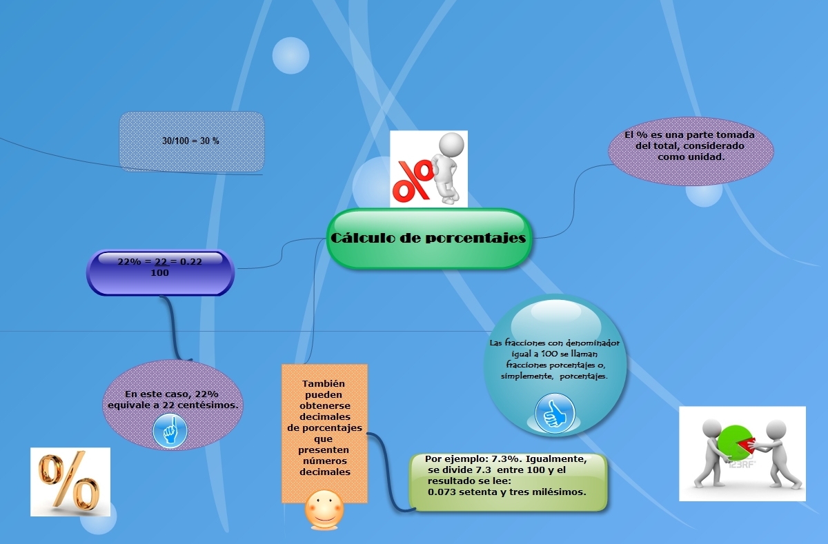 Encontrar el porcentaje de un número Para determinar el porcentaje de un número sigue los siguientes pasos: Multiplica el número por el porcentaje (ej. 87 * 68 = 5916) Divide el resultado por 100 (Mueve el punto decimal dos lugares hacia la izquierda) (ej. 5916/100=59.16) Redondea a la precisión deseada (ej. 59.16 redondeado al número entero más próximo=59)