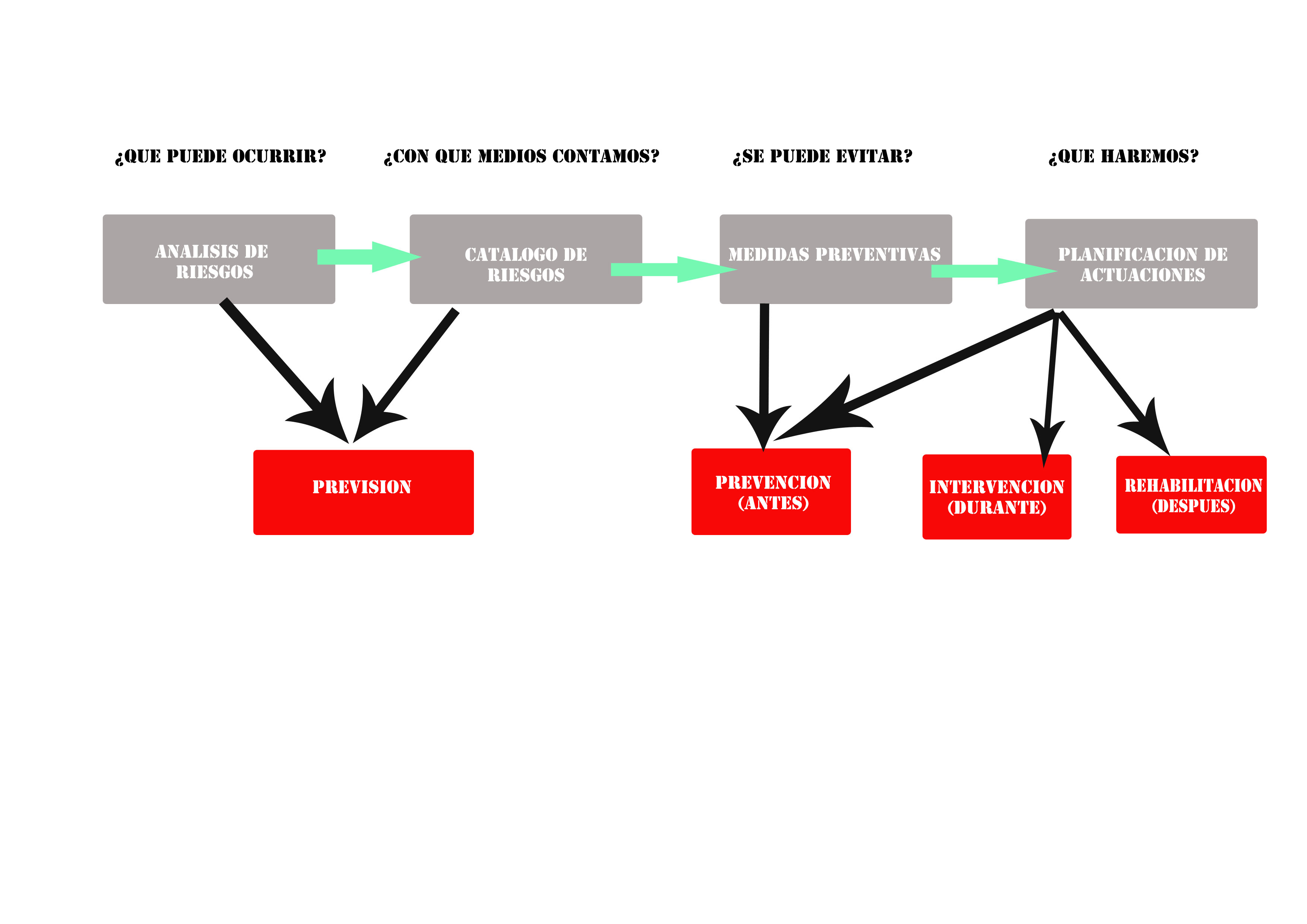 Prevision - Analisis de riesgos Prevencion - Implantacion de medidas Planificacion - Lineas de actuacion Intervencion - Actuaciones (Proteger y socorrer) Rehabilitacion - Restableccimento SSPP