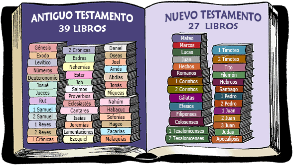 2.LOS LIBROS DEL ANTIGUO TESTAMENTO: SE DIVIDEN EN CUATRO GRUPOS (39 libros) a.LOS LIBROS DE LEY: Génesis: Registra el principio del universo, del hombre, el Sábado, matrimonio, pecado, sacrificio, naciones, gobierno, y hombres llaves de Dios como Abraham, Isaac, Jacob, y José. Éxodo: Detalles de cómo Israel se volvió una nación con Moisés como el líder. Israel es libertado de la esclavitud en Egipto y viaja al Monte Sinaí dónde la ley de Dios fue dada. Levítico: Este libro era un manual de adoración para Israel. Proporciona la instrucción a los líderes religiosos y explica cómo personas pecadoras pueden acercarse a un Dios justo. Relacionase a la venida de Jesucristo como el Cordero de Dios que se lleva los pecados del mundo. Números: Registra los 40 años de Israel vagando en el desierto como un resultado de la desobediencia a Dios. El título del libro es de dos numeraciones (los censos de la población) tomadas durante la luenga jornada. Deuteronomio: Registra los último días de vida de Moisés y repasa las leyes dadas en Éxodo y Levítico. b.LOS LIBROS DE HISTORIA: Josué: Detalles de cómo Josué, el sucesor de Moisés, llevó el pueblo de Israel a la Tierra Prometida de Canaán. Registra las campañas militares y la división de la tierra entre el pueblo. Jueces: Israel se distanció de Dios después de la muerte de Josué. Este libro registra la triste historia de sus pecados repetidos y los jueces que Dios levantó para líbralos de las fuerzas enemigas. Rut: La historia de Rut, una mujer de la nación Gentil de Moab que escogió servir el Dios de Israel. Ella se volvió la gran abuela de David. 1 Samuel: Este libro centralizase en tres personas: Samuel que fue el último de los jueces de Israel; Saúl, el primer rey de Israel; y David que sucedió a Saúl como el rey. 2 Samuel: Los gloriosos 40 años del reino de Rey David se registran en este libro. 1 Reyes: El reino de Rey Salomón y los reyes del reino dividido hasta los reinos de Acab en el norte y Josafat en el sur son los asuntos de este libro. 2 Reyes: La decadencia final de Israel y Judá se registra en este libro. El pueblo de Dios entró en profundo pecado. 1 Crónicas: El reino de David y las preparaciones por construir el templo se registra aquí. La cronología de este libro es igual que 2 Samuel. 2 Crónicas: Este libro continúa la historia de Israel a través del reino de Salomón con enfoque en el reino del sur. Él cierra con el decreto de Ciro que permitió el retorno de las personas de Babilonia a Jerusalén. Esdras: El retorno de los judíos del cautiverio babilónico se detalla. Nehemías: La reconstrucción de los muros de Jerusalén bajo el liderazgo de Nehemías se registra en este libro. El proyecto empezó aproximadamente 14 años después del retorno de Esdras con las personas. Ester: La de los judíos realizada por Dios a través de Ester y Mardoqueo es el asunto de este libro. c.LOS LIBROS DE POESÍA: Job: Este libro es la historia de Job, un hombre que vivió alrededor del tiempo de Abraham. El tema del libro es la pregunta de por qué los hombres justo sufren. Salmos: El libro de oración y alabanza de la Biblia. Proverbios: la sabiduría Divina para los problemas prácticos de la vida cotidiana. Eclesiastés: Una discusión de la futileza la de vida aparte de Dios. Cantares De Salomón: El romance de Salomón y su novia, la Sulamita. La historia representa el amor de Dios por Israel y de Cristo por la iglesia. d.LOS LIBROS DE PROFECÍA: Algunos de estos libros fueron escritos durante un periodo cuando la nación de Israel estaba dividida en dos reinos separados: Israel y Judá. Isaías: Advierte del juicio venidero contra Judá debido a su pecado contra Dios. Jeremías: Escrito durante el declive y queda final de Judá. Habla del juicio venidero y de la pronta rendición a Nabucodonosor. Lamentaciones: El lamento de Jeremias (la expresión de dolor) por causa de la destrucción de Jerusalén por Babilonia. Ezequiel: Primero advierte de la caída sin impedimento de Jerusalén y entonces predice su restauración futura. Daniel: El profeta Daniel fue capturado durante el inicio del cerco de Judá y llevado a Babilonia. Este libro proporciona una enseñanza histórica y profética que es importante para la comprensión de la profecía Bíblica. Oseas: El Tema de este libro es la infidelidad de Israel, su castigo, y restauración por Dios. Joel: Cuenta las plagas que anunciarían el juicio futuro. Amós: Durante un periodo de prosperidad material pero el decaimiento moral, Amós advirtió Israel y las naciones circundantes del juicio del futuro de Dios en su pecado. Abdías: El juicio de Dios contra Edom, una nación maligna localizada al sur del Mar Muerto. Jonás: La historia del profeta Jonás que predicó el arrepentimiento en Nínive, la ciudad capital del imperio Asirio. El libro revela el amor de Dios y Su plan de arrepentimiento para los Gentiles. Miqueas: Otra profecía contra el pecado de Israel. Predice el lugar de nacimiento de Jesús 700 años antes del evento acontecer. Nahúm: Cuenta la destrucción inminente de Nínive que se había salvado unos 150 años antes a través de la predicación de Jonás. Habacuc: Revela el plan de Dios para castigar una nación pecadora por una mucho más pecadora. Enseña que "el justo vivirá por la fe". Zacarías: el Juicio y restauración de Judá. Hageo: Exhorta los judíos para reconstruir el templo después de un atraso de 15 años debido a la resistencia enemiga. Zacarías: Posterior exhortación para completar el templo y renovar el compromiso espiritual. Predice la primera y segunda venida de Cristo. Malaquías: Advierte contra la poca profundidad espiritual y predice la venida de Juan Bautista y Jesús.