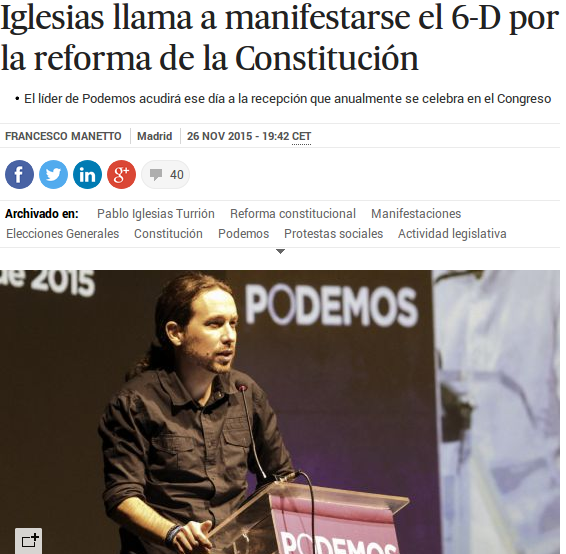 La opinión de Pablo Iglesias el "lider" de podemos para manifestrase sobre un tema de la reforma constitucional se describe en el siguiente enlace: http://politica.elpais.com/politica/2015/11/26/actualidad/1448562124_622708.html