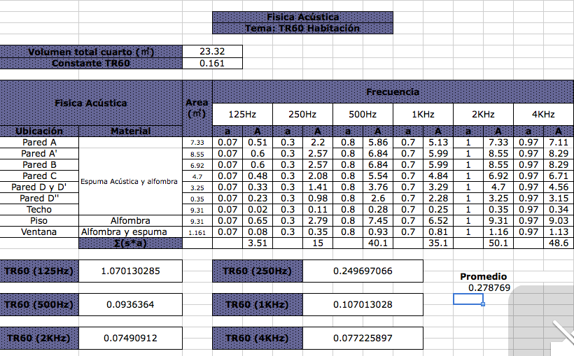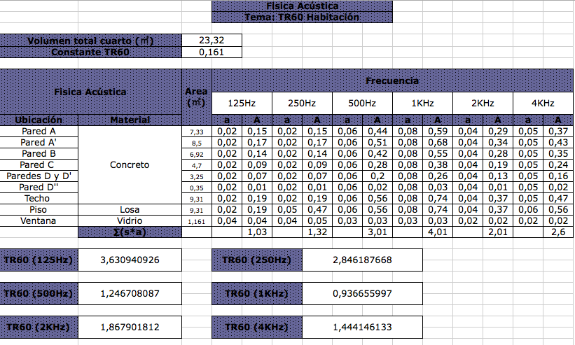 Planos, calculo de areas, volumen y TR60 de la habitaciónSe mostraran las dimensiones del cuarto, y los cálculos necesarios para calcular el tiempo que tarda en decaer 60 dB la reverberación del cuarto y algunas fotos de evidencia de pruebas que se hicieron con un app para medir dicho TR60 que nos dio un promedio de 1.83s.