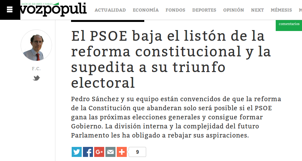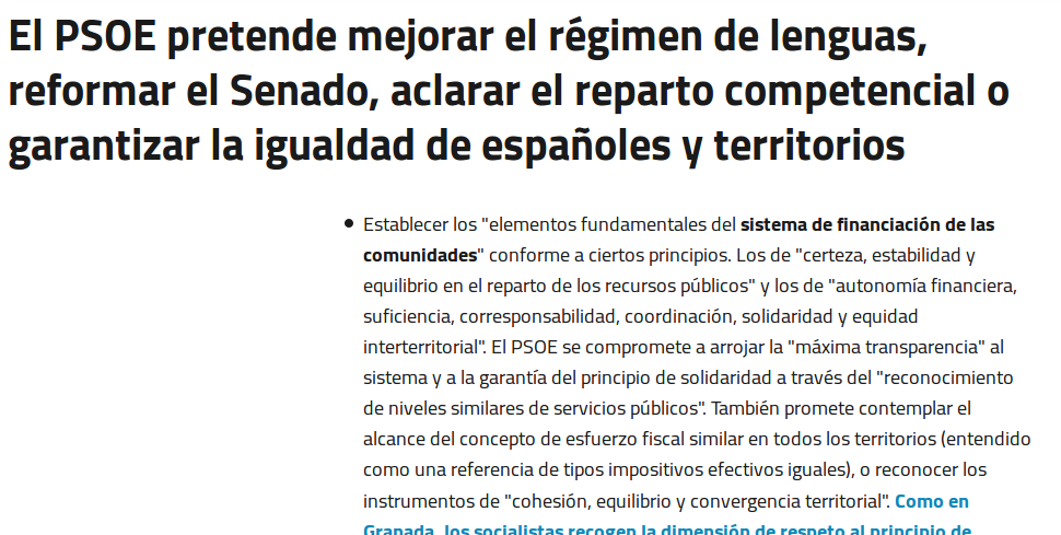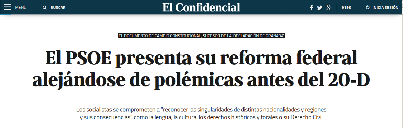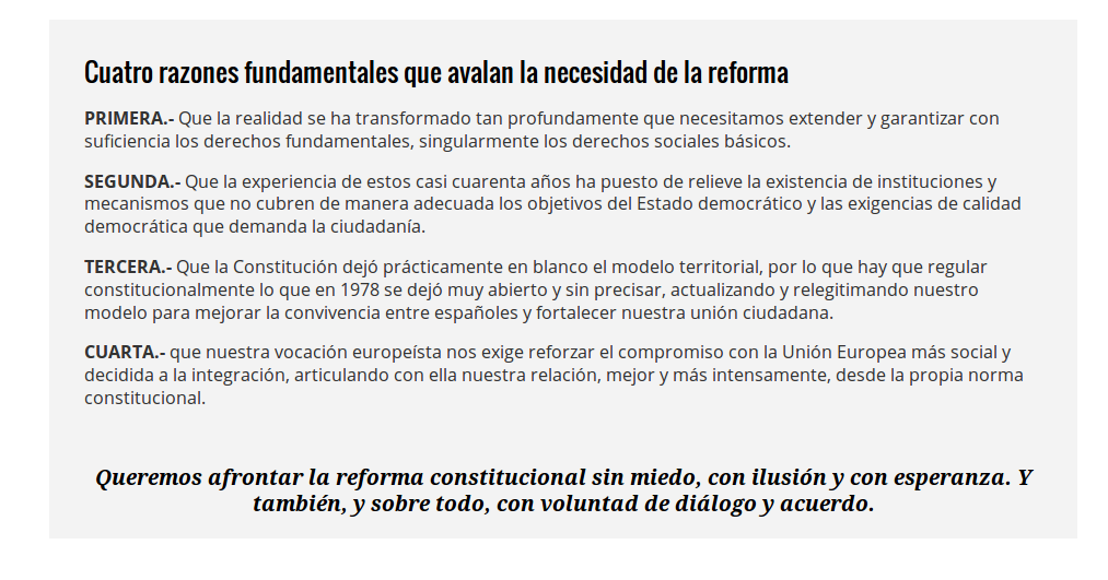 PSOE: " Queremos afrontar la reforma constitucional sin miedo, con ilusión y con esperanza. Y también, y sobre todo, con voluntad de diálogo y acuerdo" Pedro Sánchez y su equipo están convencidos de que la reforma de la Constitución que abanderan solo será posible si el PSOE gana las próximas elecciones generales y consigue formar Gobierno. La división interna y la complejidad del futuro Parlamento les ha obligado a rebajar sus aspiraciones. Los socialistas señalan cuatro razones para modificar la Carta Magna: extender y garantizar con suficiencia los derechos fundamentales, aumentar la calidad democrática, corregir el modelo territorial (que los constituyentes dejaron "prácticamente en blanco") y reflejar la "vocación europeísta" de España. El PSOE plantea nueve puntos a saber : Incluir en la Constitución a las comunidades autónomas "por su nombre" y la referencia a las ciudades de Ceuta y Melilla. Mejorar el régimen de cooficialidad de las lenguas de España con el objetivo de establecer su reconocimiento como lenguas del Estado. Reformar el Senado para hacer de él una "auténtica Cámara territorial". ¿Qué implica eso? Redefinir sus funciones para que se vinculen a las derivadas de esa función territorial. Incluir el principio de "lealtad federal" entre el Estado y las comunidades. Racionalizar, clarificar y completar el sistema de distribución competencial. Atribuir al Estado "la garantía de la igualdad de todos los españoles en sus condiciones básicas de vida" Establecer los "elementos fundamentales del sistema de financiación de las comunidades" conforme a ciertos principios. Los de certeza, estabilidad y equilibrio en el reparto de los recursos públicos y los de autonomía financiera, suficiencia, corresponsabilidad, coordinación, solidaridad y equidad interterritorial. Configurar en la Constitución "una autonomía local fortalecida y sostenida sobre los principios de competencias propias, subsidariedad y suficiencia financiera. Mantener la unidad del poder judicial y la preeminencia del Tribunal Supremo